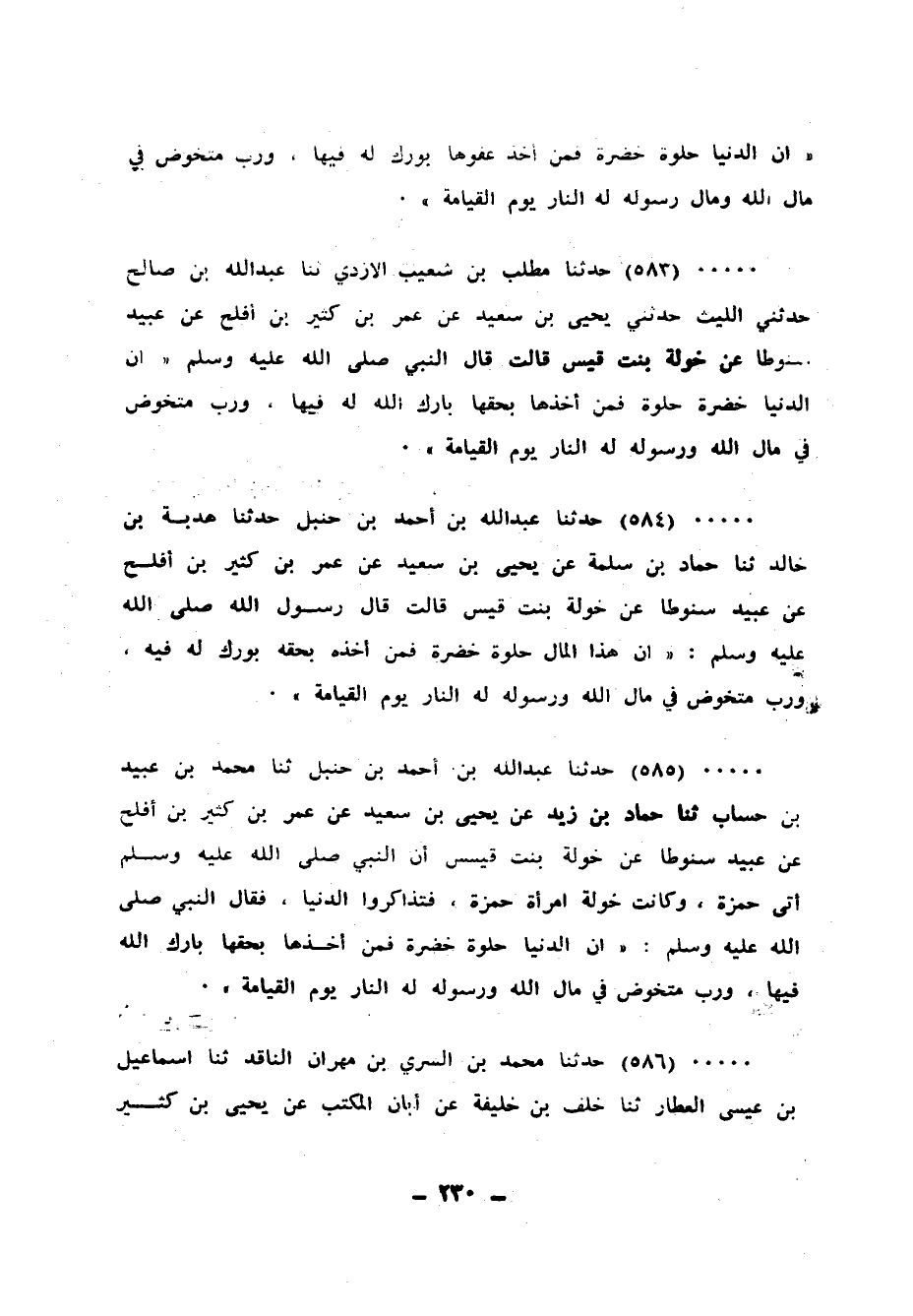 585 - حَدَّثَنَا عَبْدُ اللهِ بْنُ أَحْمَدَ بْنِ حَنْبَلٍ، ثنا مُحَمَّدُ بْنُ عُبَيْدِ بْنِ حِسَابٍ، ثنا حَمَّادُ بْنُ زَيْدٍ، عَنْ يَحْيَى بْنِ سَعِيدٍ، عَنْ عُمَرَ بْنِ كَثِيرِ بْنِ أَفْلَحَ، عَنْ عُبَيْدِ سَنُوطَا، عَنْ خَوْلَةَ بِنْتِ قَيْسٍ، أَنَّ النَّبِيَّ صَلَّى اللهُ عَلَيْهِ وَسَلَّمَ أَتَى حَمْزَةَ وَكَانَتْ خَوْلَةُ امْرَأَةُ حَمْزَةَ فَتَذَاكَرُوا الدُّنْيَا فَقَالَ النَّبِيُّ صَلَّى اللهُ عَلَيْهِ وَسَلَّمَ: «إِنَّ §الدُّنْيَا حُلْوَةٌ خَضِرَةٌ فَمَنْ أَخَذَهَا بِحَقِّهَا بَارِكَ اللهُ فِيهَا وَرَبَّ مُتَخَوِّضٍ فِي مَالِ اللهِ وَرَسُولِهِ لَهُ النَّارُ يَوْمَ الْقِيَامَةِ»
