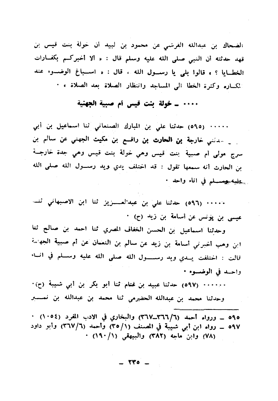 597 - حَدَّثَنَا عُبَيْدُ بْنُ غَنَّامٍ، ثنا أَبُو بَكْرِ بْنِ أَبِي شَيْبَةَ، ح وَحَدَّثَنَا مُحَمَّدُ بْنُ عَبْدِ اللهِ الْحَضْرَمِيُّ، ثنا مُحَمَّدُ بْنُ عَبْدِ اللهِ بْنِ نُمَيْرٍ، وَيَحْيَى الْحِمَّانِيُّ، قَالُوا: ثنا وَكِيعٌ، عَنْ أُسَامَةَ بْنِ زَيْدٍ، عَنْ سَالِمِ بْنِ النُّعْمَانِ بْنِ خَرَّبُوذَ، قَالَ: سَمِعْتُ أُمَّ صُبَيَّةَ الْجُهَنِيَّةَ، تَقُولُ: «§اخْتَلَفَتْ يَدِي مَعَ النَّبِيِّ صَلَّى اللهُ عَلَيْهِ وَسَلَّمَ فِي الْوُضُوءِ مِنْ إِنَاءٍ وَاحِدٍ»