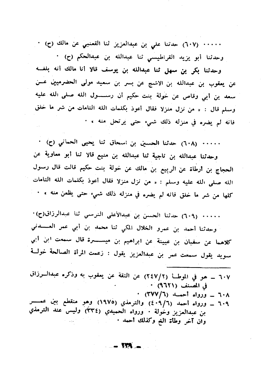607 - حَدَّثَنَا عَلِيُّ بْنُ عَبْدِ الْعَزِيزِ، ثنا الْقَعْنَبِيُّ، عَنْ مَالِكٍ، ح وَحَدَّثَنَا أَبُو يَزِيدَ الْقَرَاطِيسِيُّ، ثنا عَبْدُ اللهِ بْنُ عَبْدِ الْحَكَمِ، ح وَحَدَّثَنَا بَكْرُ بْنُ سَهْلٍ، ثنا عَبْدُ اللهِ بْنُ يُوسُفَ، قَالَا: أَنَا مَالِكٌ، أَنَّهُ: بَلَغَهُ عَنْ يَعْقُوبَ بْنِ عَبْدِ اللهِ بْنِ الْأَشَجِّ، عَنْ بُسْرِ بْنِ سَعِيدٍ، مَوْلَى الْحَضْرَمِيِّينَ، عَنْ سَعْدِ بْنِ أَبِي وَقَّاصٍ، عَنْ خَوْلَةَ بِنْتِ حَكِيمٍ، أَنَّ رَسُولَ اللهِ صَلَّى اللهُ عَلَيْهِ وَسَلَّمَ قَالَ: «§مَنْ نَزَلَ مَنْزِلًا فَقَالَ أَعُوذُ بِكَلِمَاتِ اللهِ التَّامَّاتِ مِنْ شَرِّ مَا خَلَقَ فَإِنَّهُ لَمْ يَضُرَّهُ فِي مَنْزِلِهِ ذَلِكَ شَيْءٌ حَتَّى يَرْتَحِلَ مِنْهُ»