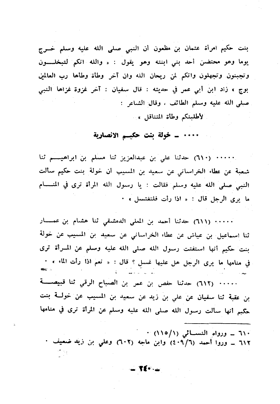 611 - حَدَّثَنَا أَحْمَدُ بْنُ الْمُعَلَّى الدِّمَشْقِيُّ، ثنا هِشَامُ بْنُ عَمَّارٍ، ثنا إِسْمَاعِيلُ بْنُ عَيَّاشٍ، عَنْ عَطَاءٍ الْخُرَاسَانِيِّ، عَنْ سَعِيدِ بْنِ الْمُسَيِّبِ، عَنْ خَوْلَةَ بِنْتِ حَكِيمٍ، أَنَّهَا: اسْتَفْتَتْ رَسُولَ اللهِ صَلَّى اللهُ عَلَيْهِ وَسَلَّمَ عَنِ الْمَرْأَةِ تَرَى فِي مَنَامِهَا مَا يَرَى الرَّجُلُ هَلْ عَلَيْهَا غُسْلٌ؟، قَالَ: «§نَعَمْ إِذَا رَأَتِ الْمَاءَ»