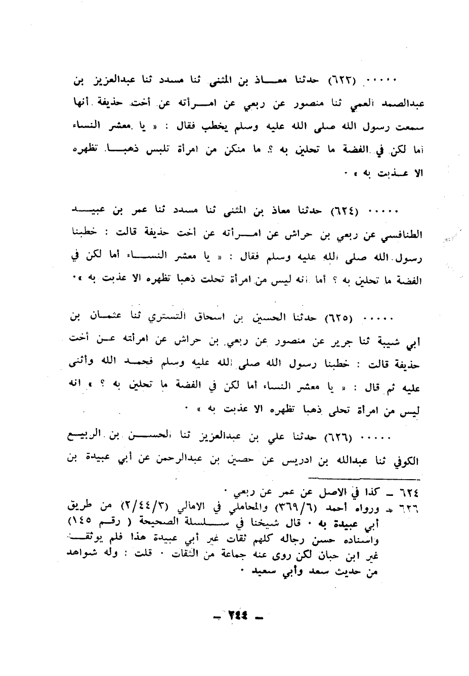 624 - حَدَّثَنَا مُعَاذُ بْنُ الْمُثَنَّى، ثنا مُسَدَّدٌ، ثنا عُمَرُ بْنُ عُبَيْدٍ الطَّنَافِسِيُّ، عَنْ رِبْعِيِّ بْنِ حِرَاشٍ، عَنِ امْرَأَتِهِ، عَنْ أُخْتِ حُذَيْفَةَ، قَالَتْ: خَطَبَنَا رَسُولُ اللهِ صَلَّى اللهُ عَلَيْهِ وَسَلَّمَ فَقَالَ: «§يَا مَعْشَرَ النِّسَاءِ أَمَا لَكُنَّ فِي الْفِضَّةِ مَا تَحَلَّيْنَ بِهِ، أَمَا أَنَّهُ لَيْسَ مِنِ امْرَأَةٍ تَحَلَّتْ ذَهَبًا تُظْهِرُهُ إِلَّا عُذِّبَتْ بِهِ»