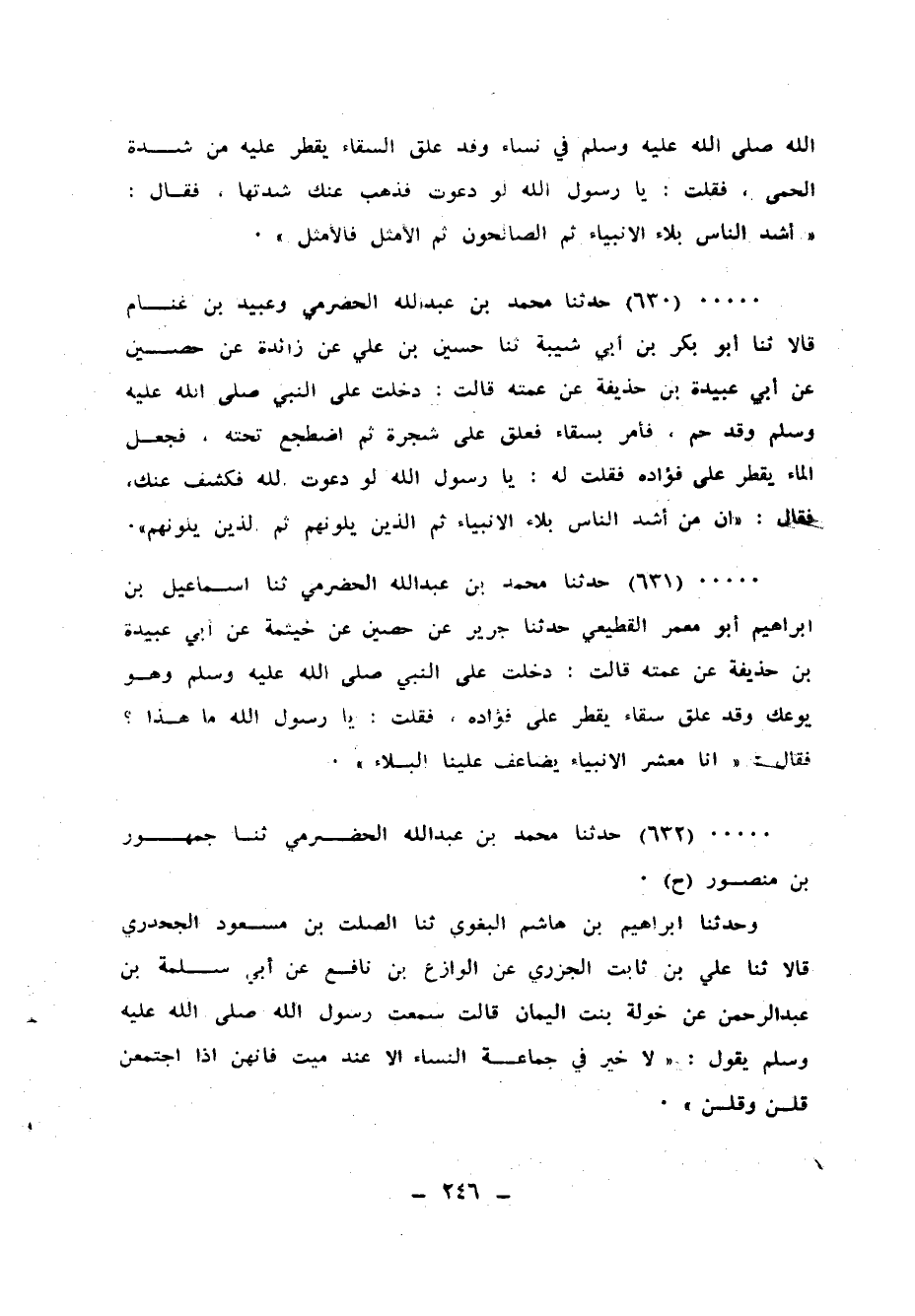 630 - حَدَّثَنَا مُحَمَّدُ بْنُ عَبْدِ اللهِ الْحَضْرَمِيُّ، وَعُبَيْدُ بْنُ غَنَّامٍ، قَالَا: ثنا أَبُو بَكْرِ بْنِ أَبِي شَيْبَةَ، ثنا حُسَيْنُ بْنُ عَلِيٍّ، عَنْ زَائِدَةَ، عَنْ حُصَيْنٍ، عَنْ أَبِي عُبَيْدَةَ بْنِ حُذَيْفَةَ، عَنْ عَمَّتِهِ، قَالَتْ: دَخَلْتُ عَلَى النَّبِيِّ صَلَّى اللهُ عَلَيْهِ وَسَلَّمَ، وَقَدْ حُمَّ فَأَمَرَ بِسِقَاءٍ فَعُلِّقَ عَلَى شَجَرَةٍ، ثُمَّ اضْطَجَعَ تَحْتَهُ فَجَعَلَ الْمَاءُ يَقْطُرُ عَلَى فُؤَادِهِ فَقُلْتُ لَهُ: يَا رَسُولَ اللهِ لَوْ دَعَوْتَ اللهَ فَكَشَفَ عَنْكَ فَقَالَ: «إِنَّ §مِنْ أَشَدِّ النَّاسِ بَلَاءً الْأَنْبِيَاءَ، ثُمَّ الَّذِينَ يَلُونَهُمْ، ثُمَّ الَّذِينَ يَلُونَهُمْ»