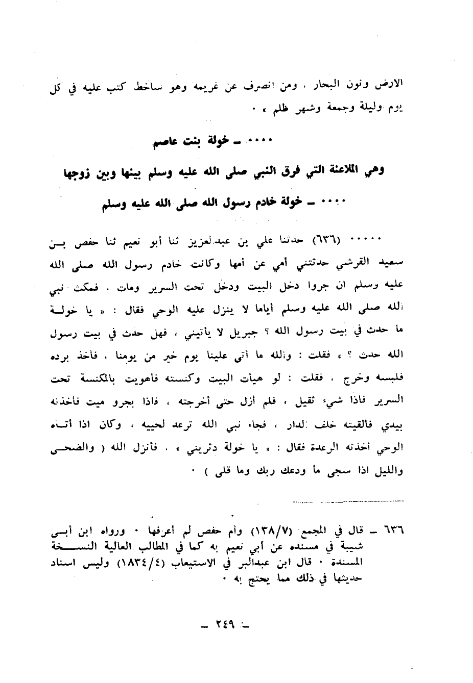 636 - حَدَّثَنَا عَلِيُّ بْنُ عَبْدِ الْعَزِيزِ، ثنا أَبُو نُعَيْمٍ، ثنا حَفْصُ بْنُ سَعِيدٍ الْقُرَشِيُّ، حَدَّثَتْنِي أُمِّي، عَنْ أُمِّهَا، وَكَانَتْ خَادِمَ رَسُولِ اللهِ صَلَّى اللهُ عَلَيْهِ وَسَلَّمَ، أَنَّ جِرْوًا دَخَلَ الْبَيْتَ وَدَخَلَ تَحْتَ السَّرِيرِ وَمَاتَ فَمَكَثَ نَبِيُّ اللهِ صَلَّى اللهُ عَلَيْهِ وَسَلَّمَ، أَيَّامًا لَا يَنْزِلُ عَلَيْهِ الْوَحْيُ، فَقَالَ: " يَا خَوْلَةُ مَا حَدَثَ فِي بَيْتِ رَسُولِ اللهِ جِبْرِيلُ لَا يَأْتِينِي فَهَلْ حَدَثَ فِي بَيْتِ رَسُولِ اللهِ حَدَثٌ فَقُلْتُ: وَاللهِ مَا أَتَى عَلَيْنَا يَوْمٌ خَيْرٌ مِنْ يَوْمِنَا فَأَخَذَ بُرْدَهُ فَلَبِسَهُ وَخَرَجَ فَقُلْتُ: §لَوْ هَيَّأْتُ الْبَيْتَ، وكَنَسْتَهُ فَأَهْوَيْتُ بِالْمِكْنَسَةِ تَحْتَ السَّرِيرِ فَإِذَا شَيْءٌ ثَقِيلٌ فَلَمْ أَزَلْ حَتَّى أَخْرَجْتُهُ فَإِذَا بِجِرْوٍ مَيِّتٍ فَأَخَذْتُهُ بِيَدِي فَأَلْقَيْتُهُ خَلْفَ الدَّارِ فَجَاءَ نَبِيُّ اللهِ تَرْعَدُ لَحْيَيْهِ، وَكَانَ إِذَا أَتَاهُ الْوَحْيُ أَخَذَتْهُ الرِّعْدَةُ فَقَالَ: " يَا خَوْلَةُ دَثِّريني فَأَنْزَلَ اللهُ: " {وَالضُّحَى، وَاللَّيْلِ إِذَا سَجَى مَا وَدَّعَكَ رَبُّكَ، وَمَا قَلَى} [الضحى: 2] "