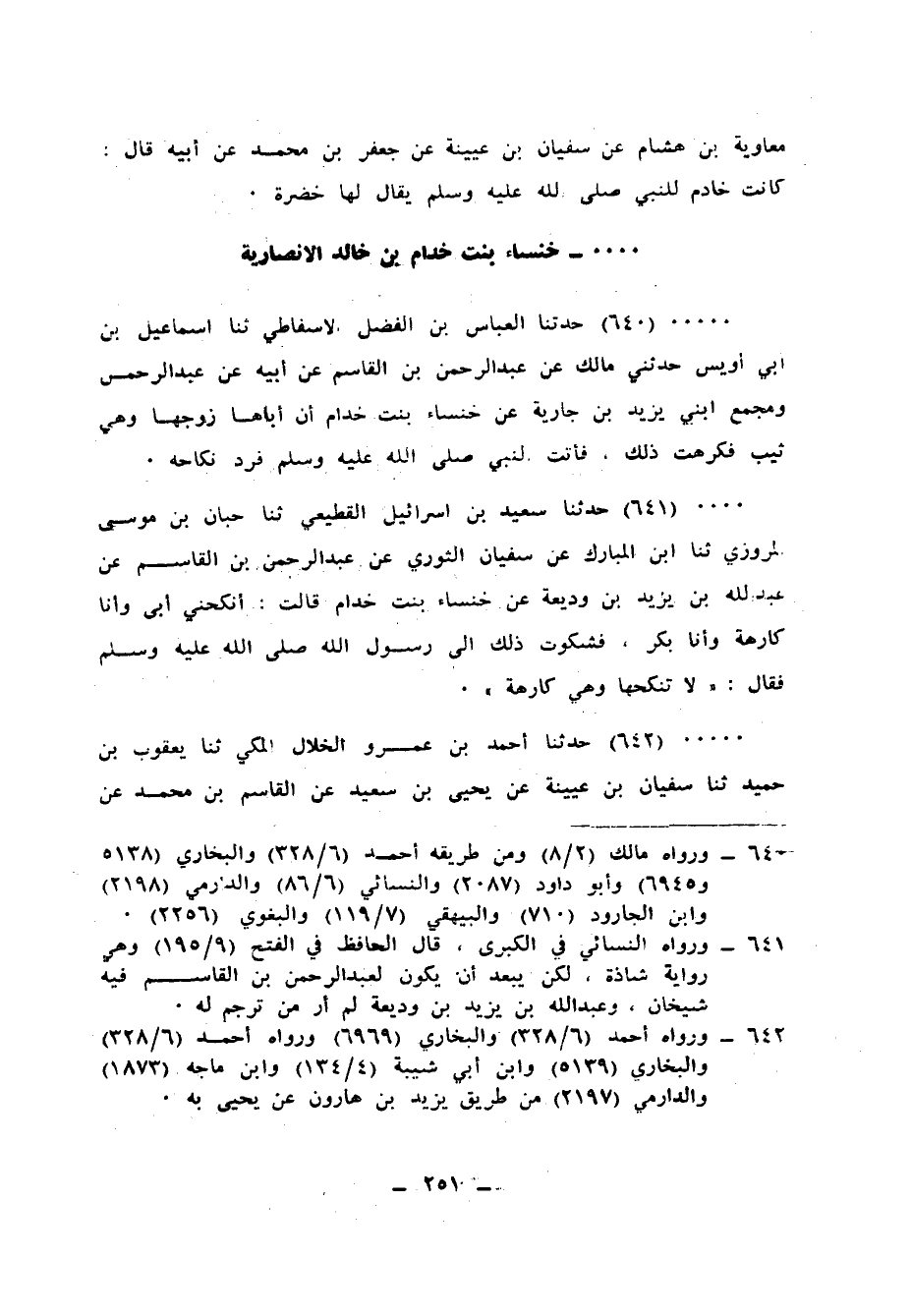 642 - حَدَّثَنَا أَحْمَدُ بْنُ عَمْرٍو الْخَلَّالُ الْمَكِّيُّ، ثنا يَعْقُوبُ بْنُ حُمَيْدٍ، ثنا سُفْيَانُ بْنُ عُيَيْنَةَ، عَنْ يَحْيَى بْنِ سَعِيدٍ، عَنِ الْقَاسِمِ بْنِ مُحَمَّدٍ، عَنْ عَبْدِ الرَّحْمَنِ، وَمُجَمِّعِ، ابْنِي يَزِيدَ بْنِ جَارِيَةَ، عَنْ خَنْسَاءَ بِنْتِ خِدَامٍ، أَنَّ أَبَاهَا §زَوَّجَهَا وَهِيَ بِنْتٌ كَارِهَةً فَرَدَّ النَّبِيُّ صَلَّى اللهُ عَلَيْهِ وَسَلَّمَ: «نِكَاحَهَا»