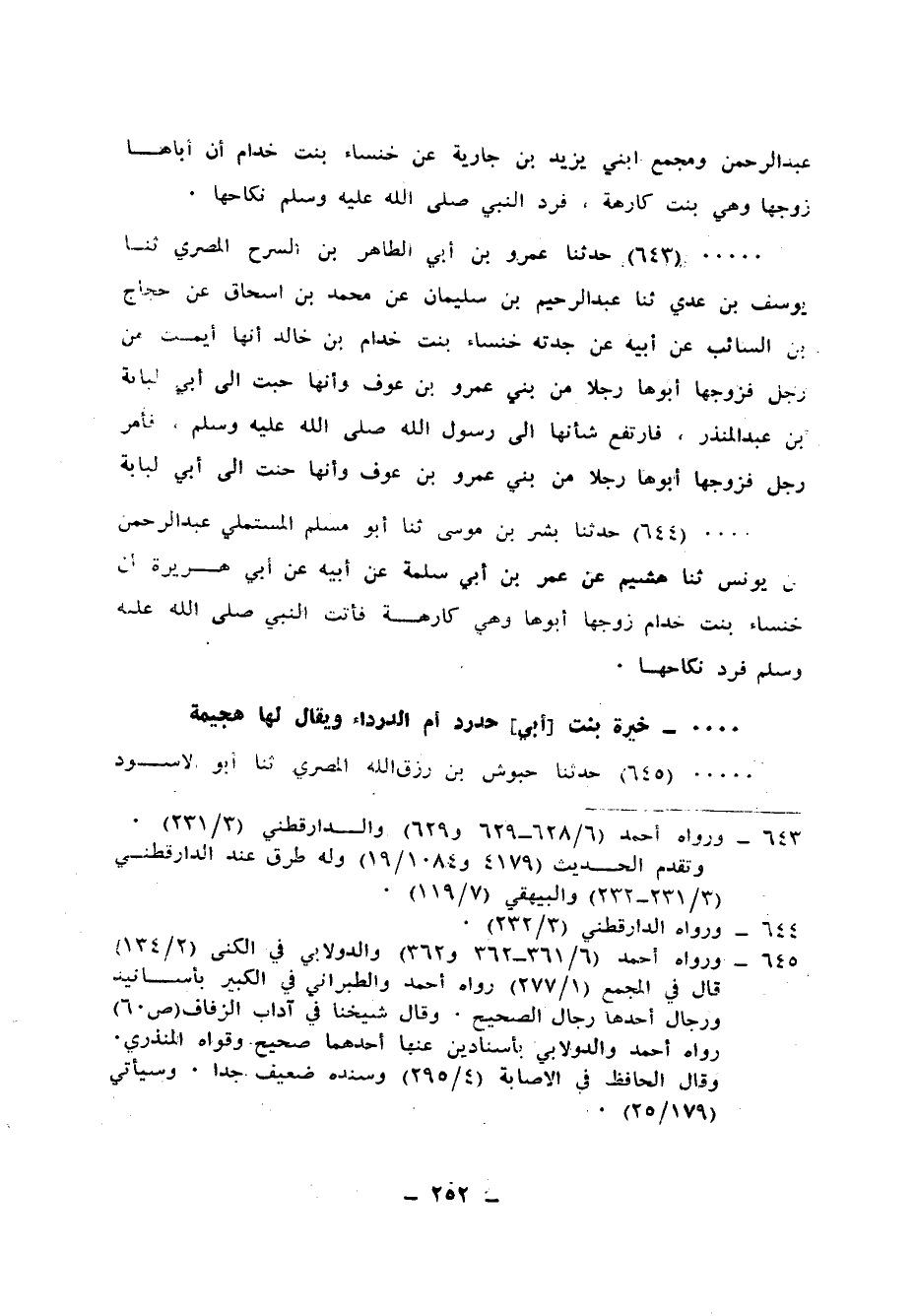 644 - حَدَّثَنَا بِشْرُ بْنُ مُوسَى، ثنا أَبُو مُسْلِمٍ الْمُسْتَمْلِي عَبْدُ الرَّحْمَنِ بْنُ يُونُسَ، ثنا هُشَيْمٌ، عَنْ عُمَرَ بْنِ أَبِي سَلَمَةَ، عَنْ أَبِيهِ، عَنْ أَبِي هُرَيْرَةَ، أَنَّ خَنْسَاءَ بِنْتَ خِدَامٍ، زَوَّجَهَا أَبُوهَا وَهِيَ كَارِهَةٌ، §فَأَتَتِ النَّبِيَّ صَلَّى اللهُ عَلَيْهِ وَسَلَّمَ، «فَرَدَّ نِكَاحَهَا»