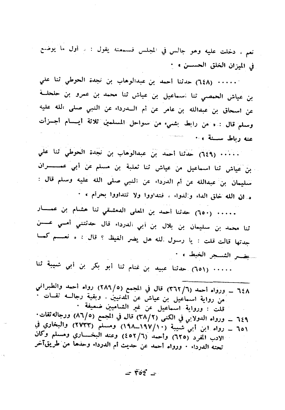 648 - حَدَّثَنَا أَحْمَدُ بْنُ عَبْدِ الْوَهَّابِ بْنِ نَجْدَةَ الْحَوْطِيُّ، ثنا عَلِيُّ بْنُ عَيَّاشٍ الْحِمْصِيُّ، ثنا إِسْمَاعِيلُ بْنُ عَيَّاشٍ، ثنا مُحَمَّدُ بْنُ عَمْرِو بْنِ حَلْحَلَةَ، عَنْ إِسْحَاقَ بْنِ عَبْدِ اللهِ بْنِ عَامِرٍ، عَنْ أُمِّ الدَّرْدَاءِ، عَنِ النَّبِيِّ صَلَّى اللهُ عَلَيْهِ وَسَلَّمَ قَالَ: «§مَنْ رَابَطَ بِشَيْءٍ مِنْ سَوَاحِلِ الْمُسْلِمِينَ ثَلَاثَةَ أَيَّامٍ أَجْزَأَتْ عَنْهُ رِبَاطَ سَنَةٍ»