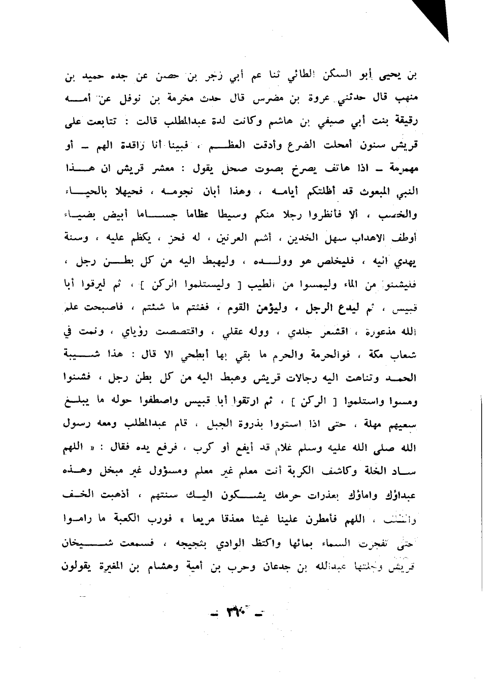 ولْيَسْتَلِمُوا الرُّكْنَ ، ثُمَّ لِيَرْقُوا أَبَا قُبَيْسٍ ، ثُمَّ لْيَدْعُ الرَّجُلُ ، ولْيُؤَمِّنِ الْقَوْمُ فَغِثْتُمْ مَا شِئْتُمْ ، فَأَصْبَحْتُ عَلِمَ اللَّهُ مَذْعُورَةً اقْشَعَرَّ جِلْدِي ، وَوَلِهَ عَقْلِي ، واقْتَصَصْتُ رُؤْيَايَ ، وَنِمْتُ فِي شِعَابِ مَكَّةَ فَوَالْحُرْمَةِ ، وَالْحَرَمِ مَا بَقِي بِهَا أَبْطَحِي إِلاَّ قَالَ : هَذَا شَيْبَةُ الْحَمْدِ ، وتَنَاهَتْ إِلَيْهِ رِجَالاَتُ قُرَيْشٍ ، وَهَبَطَ إِلَيْهِ مِنْ كُلِّ بَطْنٍ رَجُلٌ فَشُنُّوا ، وَمَسُّوا ، واسْتَلَمُوا الرُّكْنَ ، ثُمَّ ارْتَقُوا أَبَا قُبَيْسٍ ، وَاصْطَفُّوا حَوْلَهُ مَا يَبْلُغُ سَعْيُهُمْ مُهِلَّةً حَتَّى إِذَا اسْتَوُوا بِذُرْوَةِ الْجَبَلِ قَامَ عَبْدُ الْمُطَّلِبِ ، وَمَعَهُ رَسُولُ اللهِ صَلَّى اللَّهُ عَلَيْهِ وَسَلَّمَ غُلاَمٌ قَدْ أَيْفَعَ ، أَوْ كَرَبَ ، فَرَفَعَ يَدَهُ فَقَالَ : اللَّهُمَّ سَادَّ الْخَلَّةِ ، وكاشِفَ الْكُرْبَةِ ، أَنْتَ مُعَلِّمٌ غَيْرُ مُعَلَّمٍ ، ومَسْؤولٌ غَيْرُ مُبْخَلٍ ، وَهَذِهِ عَبْدَاؤُكَ وإِمَاؤُكَ بِعَذْراتِ حَرَمِكَ ، يَشْكُونَ إِلَيْكَ سَنَتَهُمْ أَذْهَبَتِ الْخُفَّ وَالظِّلْفَ ، اللَّهُمَّ فَأَمْطِرَنَّ عَلَيْنَا غَيْثًا مُعْذِقًا مَرِيعًا ، فَوَرَبِّ الْكَعْبَةِ مَا رامُوا حَتَّى تَفَجَّرَتِ السَّمَاءُ بِمَائِهَا ، واكْتَظَّ الْوَادِي بِثَجِيجِهِ فَسَمِعْتُ شِيخَانَ قُرَيْشٍ وجِلَّتَها عَبْدَ اللهِ بْنَ جُدْعَانَ ، وَحَرْبَ بْنَ أُمَيَّةَ ، وَهِشَامَ بْنَ الْمُغِيرَةِ يَقُولُونَ لِعَبْدِ الْمُطَّلِبِ : هَنِيئًا لَكَ أَبَا الْبَطْحَاءِ ، أَيْ عَاشَ بِكَ أَهْلُ الْبَطْحَاءِ ، وَفِي ذَلِكَ مَا تَقُولُ رُقَيْقَةُ بِنْتُ أَبِي صَيْفِيٍّ :