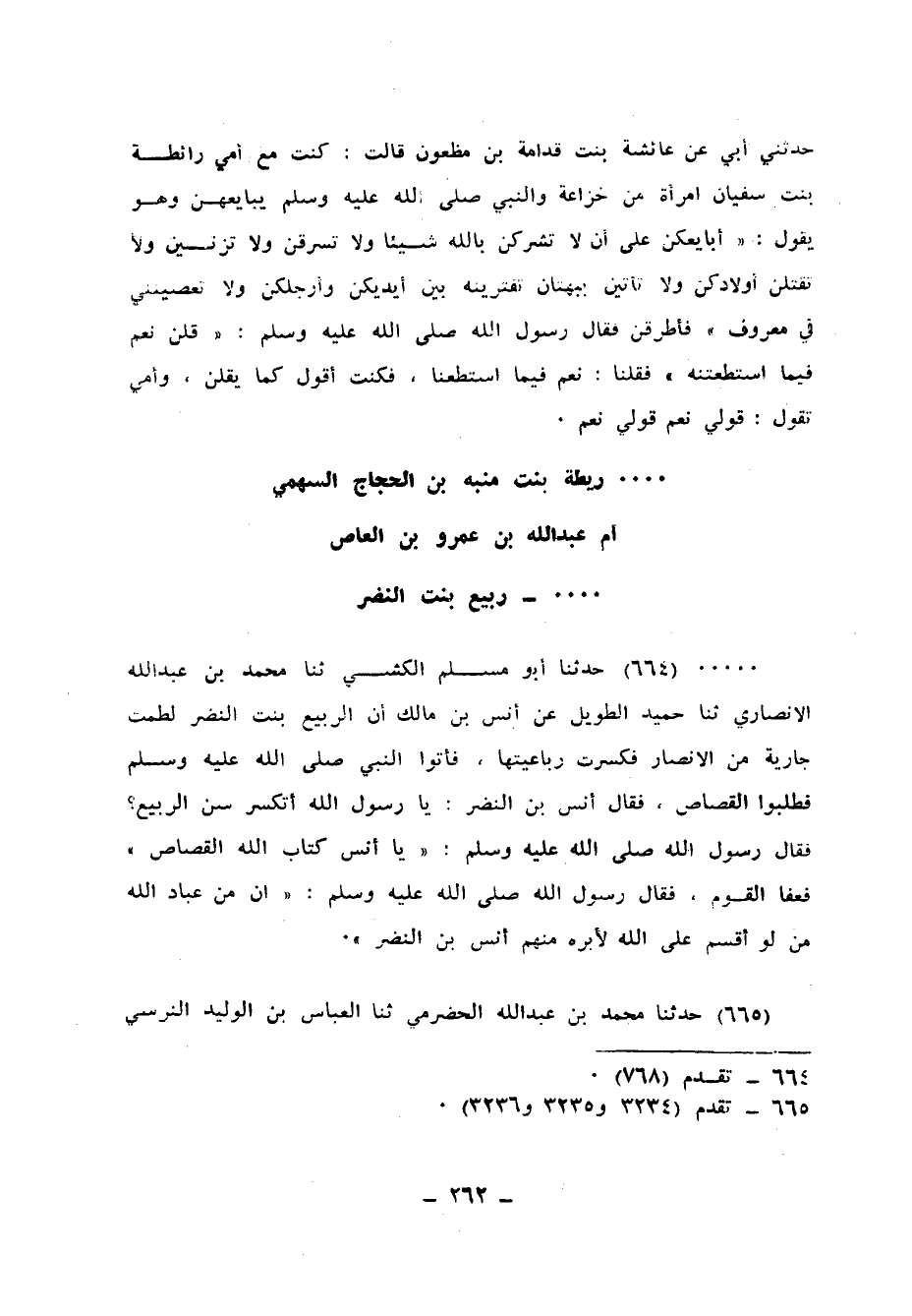 664 - حَدَّثَنَا أَبُو مُسْلِمٍ الْكَشِّيُّ، ثنا مُحَمَّدُ بْنُ عَبْدِ اللهِ الْأَنْصَارِيُّ، ثنا حُمَيْدٌ الطَّوِيلُ، عَنْ أَنَسِ بْنِ مَالِكٍ، أَنَّ الرُّبَيِّعَ بِنْتَ النَّضْرِ، لَطَمَتْ جَارِيَةً مِنَ الْأَنْصَارِ فَكَسَرَتْ رُباعِيَّتَها، فَأَتَوُا النَّبِيَّ صَلَّى اللهُ عَلَيْهِ وَسَلَّمَ، فَطَلَبُوا الْقَصَاصَ فَقَالَ أَنَسُ بْنُ النَّضْرِ: يَا رَسُولَ اللهِ أَتُكْسَرُ سِنُّ الرُّبَيِّعِ؟ فَقَالَ رَسُولُ اللهِ صَلَّى اللهُ عَلَيْهِ وَسَلَّمَ: «يَا أَنَسُ كِتَابُ اللهِ الْقَصَاصُ» ، فَعَفَا الْقَوْمُ، فَقَالَ رَسُولُ اللهِ صَلَّى اللهُ عَلَيْهِ وَسَلَّمَ: «إِنَّ §مِنْ عِبَادِ اللهِ مَنْ لَوْ أَقْسَمَ عَلَى اللهِ لَأَبَرَّهُ مِنْهُمْ أَنَسُ بْنُ النَّضْرِ»