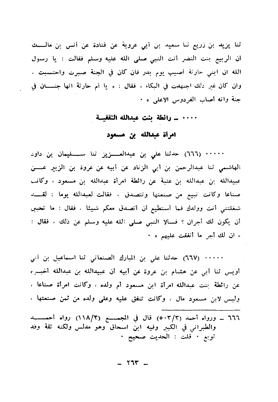 667 - حَدَّثَنَا عَلِيُّ بْنُ الْمُبَارَكِ الصَّنْعَانِيُّ، ثنا إِسْمَاعِيلُ بْنُ أَبِي أُوَيْسٍ، ثنا أَبِي، عَنْ هِشَامِ بْنِ عُرْوَةَ، عَنْ أَبِيهِ، أَنَّ عُبَيْدَ اللهِ بْنَ عَبْدِ اللهِ، أَخْبَرَهُ عَنْ رَائِطَةَ بِنْتِ عَبْدِ اللهِ، امْرَأَةِ ابْنِ مَسْعُودٍ أُمِّ وَلَدِهِ، وَكَانَتِ امْرَأَةً صَنَاعًا، وَلَيْسَ لِابْنِ مَسْعُودٍ مَالٌ، وَكَانَتْ تُنْفِقُ عَلَيْهِ وَعَلَى وَلَدِهِ مِنْ ثَمَنِ صَنْعَتِهَا، فَقَالَتْ: وَاللهِ لَقَدْ شَغَلْتَنِي أَنْتَ، وَوَلَدُكَ عَنِ الصَّدَقَةِ فَمَا أَسْتَطِيعُ أَنْ أَتَصَدَّقَ مَعَكُمْ بِشَيْءٍ، فَقَالَ: مَا أُحِبُّ إِنْ لَمْ يَكُنْ لَكِ فِي ذَلِكَ أَجْرٌ أَنْ تَفْعَلِي، فَسَأَلَتْ رَسُولَ اللهِ صَلَّى اللهُ عَلَيْهِ وَسَلَّمَ هِيَ وَهُوَ فَقَالَتْ: يَا رَسُولَ اللهِ إِنِّي امْرَأَةٌ ذَاتُ صَنْعَةٍ أَبْتَغِي بِهَا، وَلَيْسَ لِي، وَلَا لِزَوْجِي شَيْءٌ، وَلَا لِوَلَدِي فَشَغَلُونِي لَا أَتَصَدَّقُ فَقَالَ: «§لَكِ فِي ذَلِكَ أَجْرٌ مَا أَنْفَقَتِ عَلَيْهِمْ»