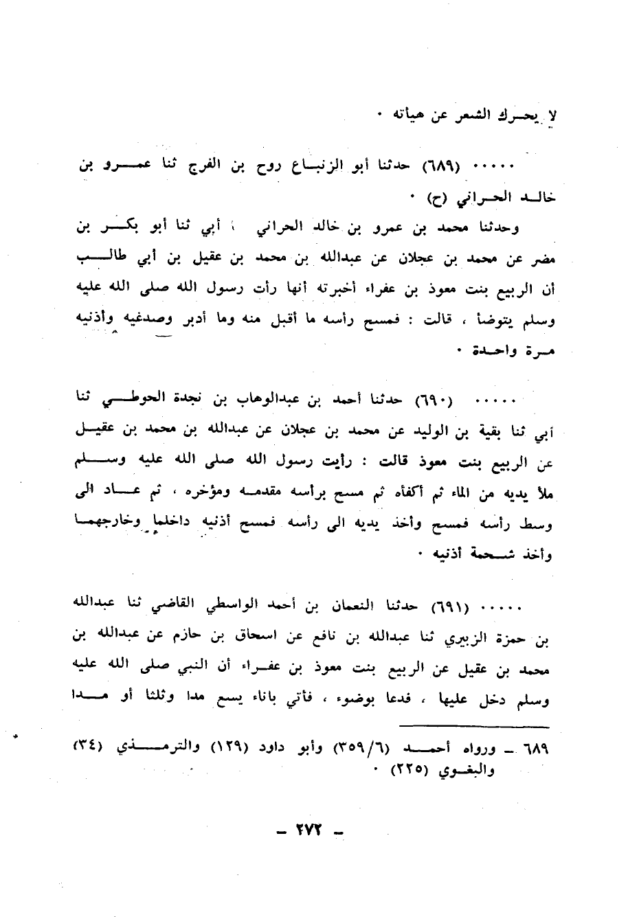 691 - حَدَّثَنَا النُّعْمَانُ بْنُ أَحْمَدَ الْوَاسِطِيُّ الْقَاضِي، ثنا عَبْدُ اللهِ بْنُ حَمْزَةَ الزُّبَيْرِيُّ، ثنا عَبْدُ اللهِ بْنُ نَافِعٍ، عَنْ إِسْحَاقَ بْنِ حَازِمٍ، عَنْ عَبْدِ اللهِ بْنِ مُحَمَّدِ بْنِ عَقِيلٍ، عَنِ الرُّبَيِّعِ بِنْتِ مُعَوِّذِ بْنِ عَفْرَاءَ، أَنَّ النَّبِيَّ صَلَّى اللهُ عَلَيْهِ وَسَلَّمَ: دَخَلَ عَلَيْهَا فَدَعَا بِوَضُوءٍ فَأُتِيَ بِإِنَاءٍ يَسَعُ مُدًّا وَثُلُثًا، أَوْ مُدًّا وَنِصْفًا مِنْ مُدِّ النَّبِيِّ صَلَّى اللهُ عَلَيْهِ وَسَلَّمَ: «§فَتَوَضَّأَ فَغَسَلَ وَجْهَهُ، ثُمَّ غَسَلَ يَدَهُ، وَمَسَحَ بِرَأْسِهِ وَمَسَحَ مُؤَخَّرَ رَأْسِهِ حَتَّى بَلَغَ وَسَطَهُ فِي كُلِّ مَسْحَةٍ» -[273]-،