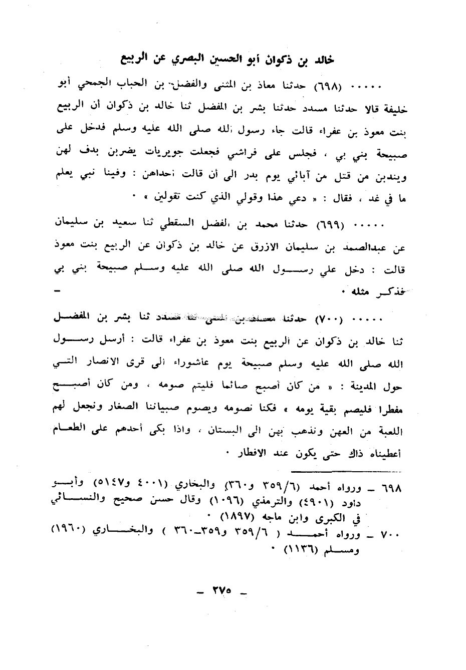 699 - حَدَّثَنَا مُحَمَّدُ بْنُ الْفَضْلِ السَّقَطِيُّ، ثنا سَعِيدُ بْنُ سُلَيْمَانَ، عَنْ عَبْدِ الصَّمَدِ بْنِ سُلَيْمَانَ الْأَزْرَقِ، عَنْ خَالِدِ بْنِ ذَكْوَانَ، عَنِ الرُّبَيِّعِ بِنْتِ مُعَوِّذٍ، قَالَتْ: دَخَلَ عَلِيَّ رَسُولُ اللهِ صَلَّى اللهُ عَلَيْهِ وَسَلَّمَ: صَبِيحَةَ بُنِيَ بِي فَذَكَرَ مِثْلَهُ
