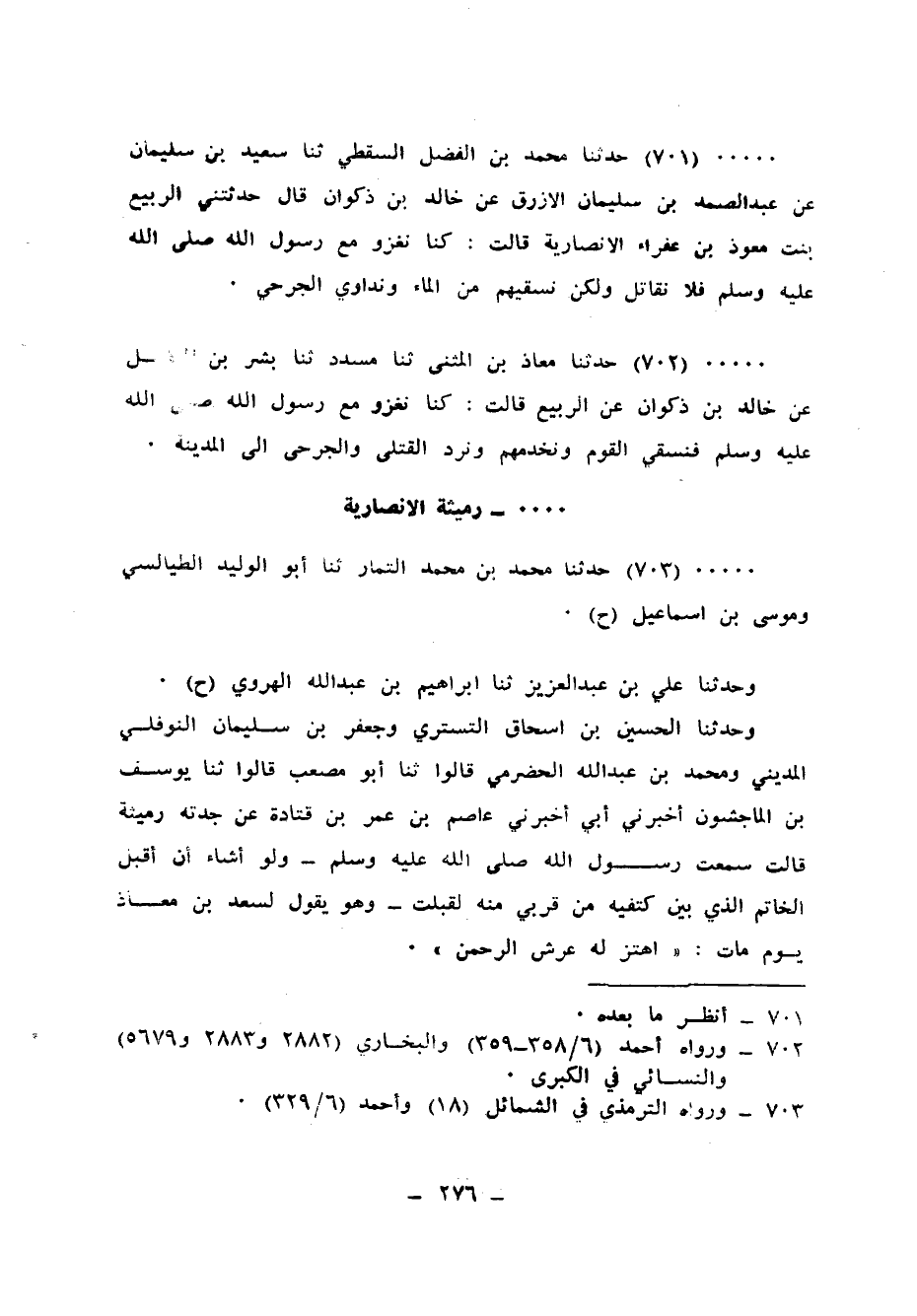 703 - حَدَّثَنَا مُحَمَّدُ بْنُ مُحَمَّدٍ التَّمَّارُ، ثنا أَبُو الْوَلِيدِ الطَّيَالِسِيُّ، وَمُوسَى بْنُ إِسْمَاعِيلَ، ح وَحَدَّثَنَا عَلِيُّ بْنُ عَبْدِ الْعَزِيزِ، ثنا إِبْرَاهِيمُ بْنُ عَبْدِ اللهِ الْهَرَوِيُّ، ح وَحَدَّثَنَا الْحُسَيْنُ بْنُ إِسْحَاقَ التُّسْتَرِيُّ، وَجَعْفَرُ بْنُ سُلَيْمَانَ النَّوْفَلِيُّ الْمَدِينِيُّ، وَمُحَمَّدُ بْنُ عَبْدِ اللهِ الْحَضْرَمِيُّ، قَالُوا: ثنا أَبُو مُصْعَبٍ، قَالُوا: ثنا يُوسُفُ بْنُ الْمَاجِشُونَ، أَخْبَرَنِي أَبِي، أَخْبَرَنِي عَاصِمُ بْنُ عُمَرَ بْنِ قَتَادَةَ، عَنْ جَدَّتِهِ رُمَيْثَةُ، قَالَتْ: سَمِعْتُ رَسُولَ اللهِ صَلَّى اللهُ عَلَيْهِ وَسَلَّمَ: وَلَوْ أَشَاءُ أَنْ أُقَبِّلَ الْخَاتَمِ الَّذِي بَيْنَ كَتِفَيْهِ مِنْ قُرْبِي مِنْهُ لَقَبَّلْتُ، وَهُوَ يَقُولُ: «§لِسَعْدِ بْنِ مُعَاذٍ يَوْمَ مَاتَ اهْتَزَّ لَهُ عَرْشُ الرَّحْمَنِ»