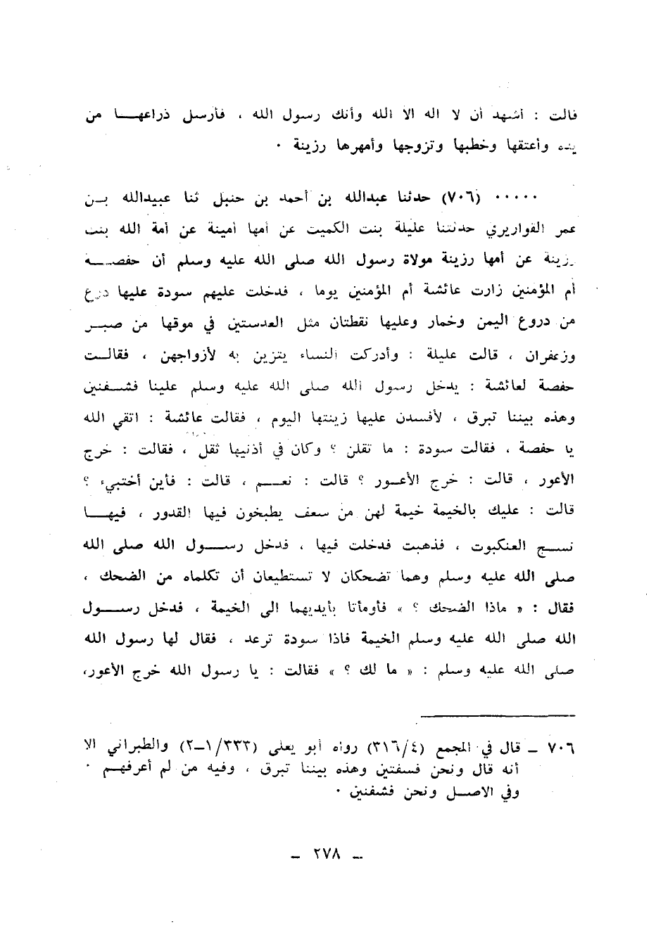 706 - حَدَّثَنَا عَبْدُ اللهِ بْنُ أَحْمَدَ بْنِ حَنْبَلٍ، ثنا عُبَيْدُ اللهِ بْنُ عُمَرَ الْقَوَارِيرِيُّ، حَدَّثَتْنَا عَلِيلَةُ بِنْتُ الْكُمَيْتِ، عَنْ أُمِّهَا أُمَيْنَةَ، عَنْ أَمَةِ اللهِ بِنْتِ رُزَيْنَةَ، عَنْ أُمِّهَا رُزَيْنَةَ، مَوْلَاةَ رَسُولِ اللهِ صَلَّى اللهُ عَلَيْهِ وَسَلَّمَ: أَنَّ حَفْصَةَ أُمَّ الْمُؤْمِنِينَ زَارَتْ عَائِشَةَ أُمَّ الْمُؤْمِنِينَ يَوْمًا، فَدَخَلَتْ عَلَيْهِمْ سَوْدَةُ عَلَيْهَا دِرْعٌ مِنْ دُرُوعِ الْيَمَنِ، وَخِمَارٌ، وَعَلَيْهَا نُقْطَتَانِ مِثْلُ الْعَدَسَتَيْنِ فِي مُوقِهَا مِنْ صَبَرٍ وَزَعْفَرَانٍ، قَالَتْ عَلِيلَةُ: وَأَدْرَكْتُ النِّسَاءَ يَتَزَيَّنَّ بِهِ لِأَزْوَاجِهِنَّ، فَقَالَتْ حَفْصَةُ لِعَائِشَةَ: يَدْخُلُ رَسُولُ اللهِ صَلَّى اللهُ عَلَيْهِ وَسَلَّمَ عَلَيْنَا فَشَفْنَينَ وَهَذِهِ بَيْنَنَا تَبْرُقُ لأُفْسِدَنَّ عَلَيْهَا زِينَتَهَا الْيَوْمَ، فَقَالَتْ عَائِشَةُ: اتَّقِي اللهَ يَا حَفْصَةُ، فَقَالَتْ سَوْدَةُ: مَا تَقُلْنَ وَكَانَ فِي أُذُنَيْها ثِقَلٌ فَقَالَتْ: خَرَجَ الْأَعْوَرُ، قَالَتْ: خَرَجَ الْأَعْوَرُ؟، قَالَتْ: نَعَمْ، قَالَتْ: فَأَيْنَ أَخْتَبِئُ؟ قَالَتْ: عَلَيْكِ بِالْخَيْمَةِ خَيْمَةٌ لَهُنَّ مِنْ سَعَفٍ يَطْبُخُونَ فِيهَا الْقُدُورَ، فِيهَا نَسْجُ الْعَنْكَبُوتِ، فَذَهَبَتْ فَدَخَلَتْ فِيهَا، فَدَخَلَ رَسُولُ اللهِ صَلَّى اللهُ عَلَيْهِ وَسَلَّمَ: وَهُمَا تَضْحَكانِ لَا تَسْتَطِيعانِ أَنْ تُكَلِّمَاهُ مِنَ الضَّحِكِ، فَقَالَ: «مَاذَا الضَّحِكُ؟» فَأَوْمَأَتا بِأَيْدِيهِمَا إِلَى الْخَيْمَةِ، فَدَخَلَ رَسُولُ اللهِ صَلَّى اللهُ عَلَيْهِ وَسَلَّمَ الْخَيْمَةَ فَإِذَا سَوْدَةُ تَرْعَدُ، فَقَالَ: لَهَا رَسُولُ اللهِ صَلَّى اللهُ عَلَيْهِ وَسَلَّمَ: «§مَا لَكِ؟» ، فَقَالَتْ: يَا رَسُولَ اللهِ خَرَجَ الْأَعْوَرُ، فَقَالَ: «مَا خَرَجَ وَلَيَخْرُجْنَ» فَدَخَلَ فَأَخَذَ بِيَدِهَا وَجَعَلَ يَنْفُضُ عَنْهَا التُّرَابَ، وَمِنَ الْعَنْكَبُوتِ