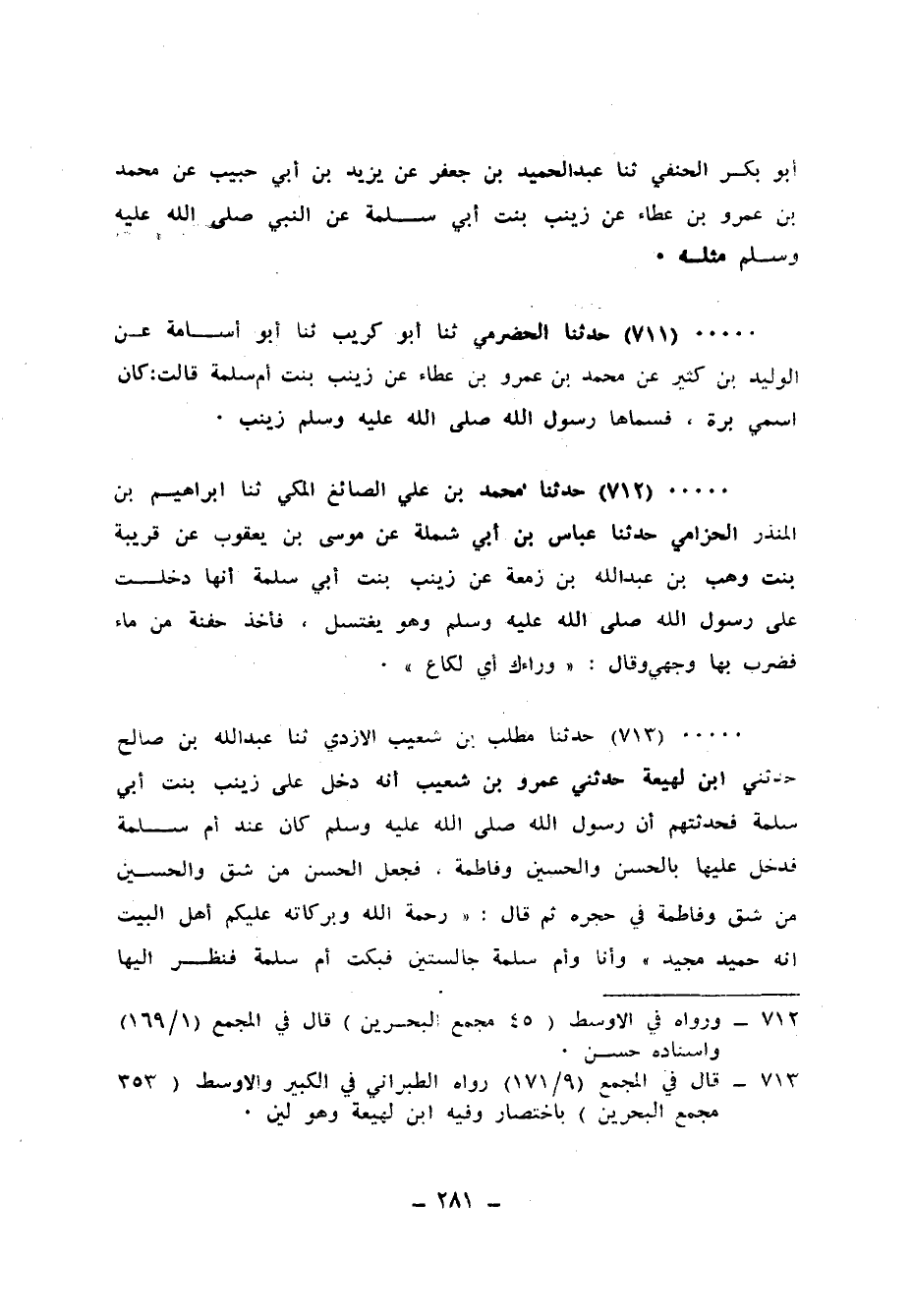 711 - حَدَّثَنَا الْحَضْرَمِيُّ، ثنا أَبُو كُرَيْبٍ، ثنا أَبُو أُسَامَةَ، عَنِ الْوَلِيدِ بْنِ كَثِيرٍ، عَنْ مُحَمَّدِ بْنِ عَمْرِو بْنِ عَطَاءٍ، عَنْ زَيْنَبَ بِنْتِ أُمِّ سَلَمَةَ، قَالَتْ: «§كَانَ اسْمِي بَرَّةَ فَسَمَّاهَا رَسُولُ اللهِ صَلَّى اللهُ عَلَيْهِ وَسَلَّمَ زَيْنَبَ»