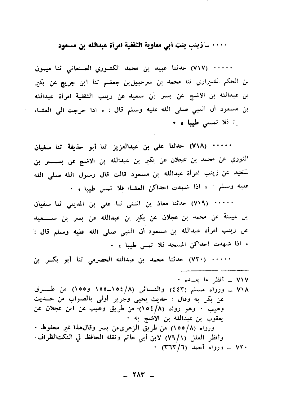 719 - حَدَّثَنَا مُعَاذُ بْنُ الْمُثَنَّى، ثنا عَلِيُّ بْنُ الْمَدِينِيُّ، ثنا سُفْيَانُ بْنُ عُيَيْنَةَ، عَنْ مُحَمَّدِ بْنِ عَجْلَانَ، عَنْ بُكَيْرِ بْنِ عَبْدِ اللهِ، عَنْ بُسْرِ بْنِ سَعِيدٍ، عَنْ زَيْنَبَ، امْرَأَةِ عَبْدِ اللهِ بْنِ مَسْعُودٍ، أَنَّ النَّبِيَّ صَلَّى اللهُ عَلَيْهِ وَسَلَّمَ قَالَ: «§إِذَا شَهِدَتْ إِحْدَاكُنَّ الْمَسْجِدَ فَلَا تَمَسَّ طِيبًا»