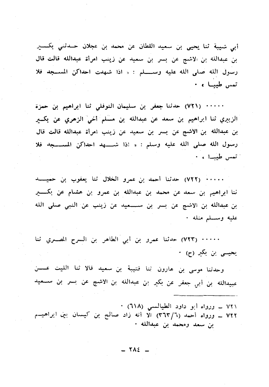 723 - حَدَّثَنَا عَمْرُو بْنُ أَبِي الطَّاهِرِ بْنِ السَّرْحِ الْمِصْرِيُّ، ثنا يَحْيَى بْنُ بُكَيْرٍ، ح وَحَدَّثَنَا مُوسَى بْنُ هَارُونَ، ثنا قُتَيْبَةُ بْنُ سَعِيدٍ، قَالَا: ثنا اللَّيْثُ، عَنْ عُبَيْدِ اللهِ بْنِ أَبِي جَعْفَرٍ، عَنْ بُكَيْرِ بْنِ عَبْدِ اللهِ بْنِ الْأَشَجِّ، عَنْ بُسْرِ بْنِ سَعِيدٍ، عَنْ زَيْنَبَ الثَّقَفِيَّةِ، أَنَّ النَّبِيَّ صَلَّى اللهُ عَلَيْهِ وَسَلَّمَ قَالَ: «§أَيَّتُكُنَّ خَرَجَتْ إِلَى الْمَسْجِدِ فَلَا تَمَسَّ طِيبًا»
