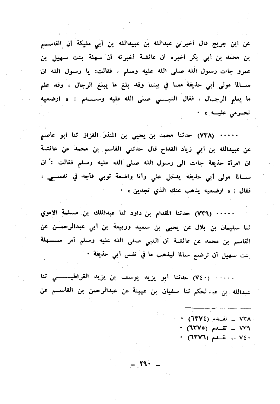 740 - حَدَّثَنَا أَبُو يَزِيدَ يُوسُفُ بْنُ يَزِيدَ الْقَرَاطِيسِيُّ، ثنا عَبْدُ اللهِ بْنُ عَبْدِ الْحَكَمِ، ثنا سُفْيَانُ بْنُ عُيَيْنَةَ، عَنْ عَبْدِ الرَّحْمَنِ بْنِ الْقَاسِمِ، عَنْ أَبِيهِ، عَنْ عَائِشَةَ، قَالَتْ: جَاءَتْ سَهْلَةُ بِنْتُ سُهَيْلٍ إِلَى رَسُولِ اللهِ صَلَّى اللهُ عَلَيْهِ وَسَلَّمَ، فَقَالَتْ: يَا رَسُولَ اللهِ إِنِّي لَأَرَى فِي وَجْهِ أَبِي حُذَيْفَةَ مِنْ أَمَرِ سَالِمٍ، فَقَالَ النَّبِيُّ صَلَّى اللهُ عَلَيْهِ وَسَلَّمَ: «§أَرْضِعِيهِ» فَقَالَتْ: إِنَّهُ كَبِيرٌ فَتَبَسَّمَ رَسُولُ اللهِ صَلَّى اللهُ عَلَيْهِ وَسَلَّمَ وَقَالَ: «أَلَيْسَ أَعْلَمُ أَنَّهُ رَجُلٌ؟» قَالَتْ: فَفَعَلَتْ، فَأَتَتْهُ فَقَالَتْ: وَالَّذِي أَكْرَمَكَ بِمَا أَكْرَمَكَ بِهِ، مَا رَأَيْتُ فِي وَجْهِ أَبِي حُذَيْفَةَ شَيْئًا