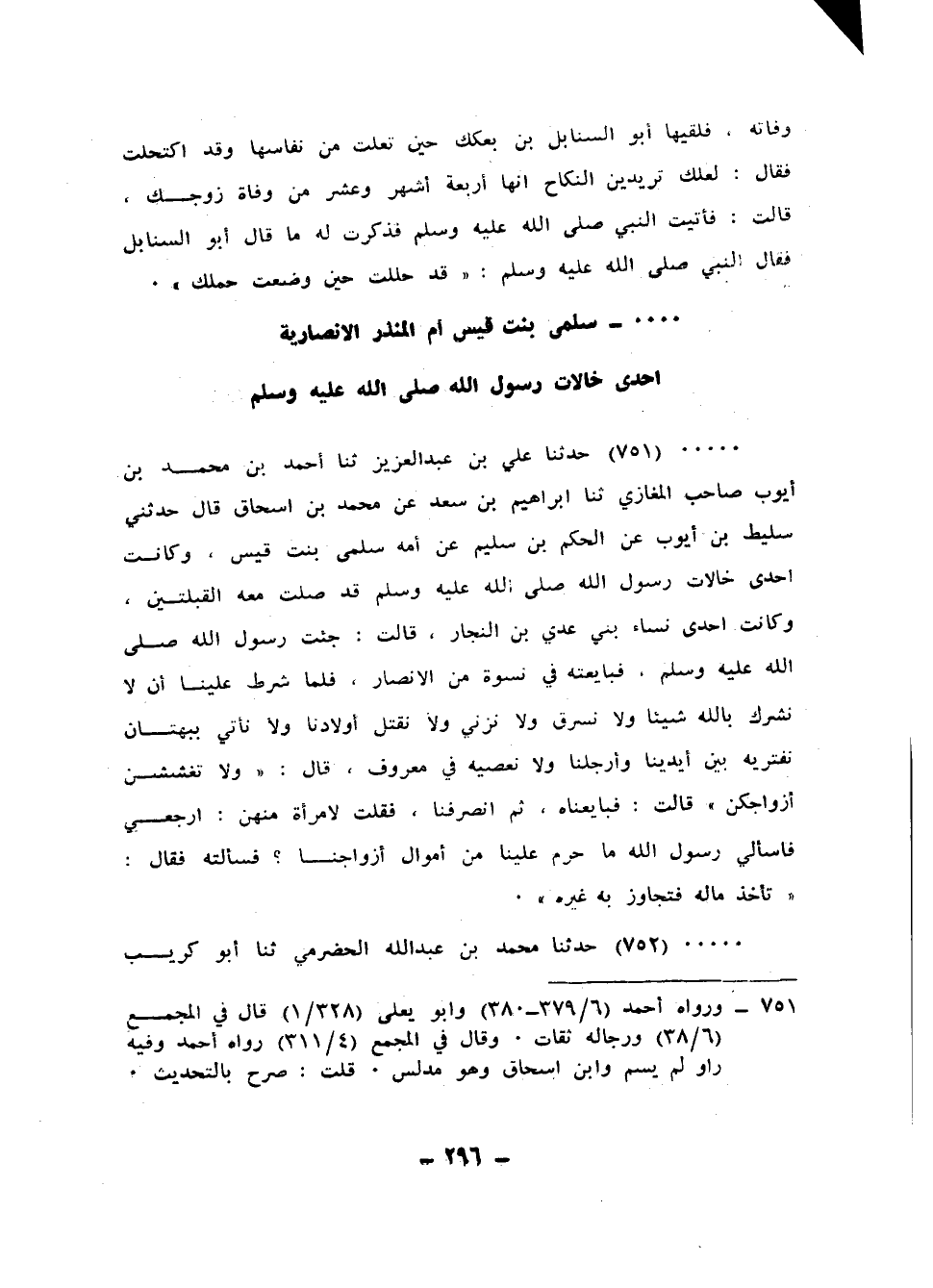 751 - حَدَّثَنَا عَلِيُّ بْنُ عَبْدِ الْعَزِيزِ، ثنا أَحْمَدُ بْنُ مُحَمَّدِ بْنِ أَيُّوبَ، صَاحِبُ الْمَغَازِي، ثنا إِبْرَاهِيمُ بْنُ سَعْدٍ، عَنْ مُحَمَّدِ بْنِ إِسْحَاقَ، قَالَ: حَدَّثَنِي سَلِيطُ بْنُ أَيُّوبَ، عَنِ الْحَكَمِ بْنِ سُلَيْمٍ، عَنْ أُمِّهِ سَلْمَى بِنْتِ قَيْسٍ - وَكَانَتْ إِحْدَى خَالَاتِ رَسُولِ اللهِ صَلَّى اللهُ عَلَيْهِ وَسَلَّمَ، قَدْ صَلَّتْ مَعَهُ الْقِبْلَتَيْنِ وَكَانَتْ إِحْدَى نِسَاءِ بَنِي عَدِيِّ بْنِ النَّجَّارِ - قَالَتْ: جِئْتُ رَسُولَ اللهِ صَلَّى اللهُ عَلَيْهِ وَسَلَّمَ فَبَايَعْتُهُ فِي نِسْوَةٍ مِنَ الْأَنْصَارِ، فَلَمَّا شَرَطَ عَلَيْنَا أَنْ لَا نُشْرِكَ بِاللهِ شَيْئًا، وَلَا نَسْرِقَ، وَلَا نَزْنِي، وَلَا نَقْتُلْ أَوْلَادَنَا، وَلَا نَأْتِي بِبُهْتَانٍ نَفْتَرِيَهُ بَيْنَ أَيْدِينَا وَأَرْجُلِنَا، وَلَا نَعْصِيَهُ فِي مَعْرُوفٍ، قَالَ: «§وَلَا تَغْشُشْنَ أَزْوَاجَكُنَّ» قَالَتْ: فَبَايَعْنَاهُ، ثُمَّ انْصَرَفْنَا، فَقُلْتُ لِامْرَأَةٍ مِنْهُنَّ: ارْجِعِي فَاسْأَلِي رَسُولَ اللهِ: مَا حَرَّمَ عَلَيْنَا مِنْ أَمْوَالِ أَزْوَاجِنَا؟ فَسَأَلْتُهُ فَقَالَ: «تَأْخُذُ مَالَهُ فَتُجَاوِزُ بِهِ غَيْرَهُ» ،