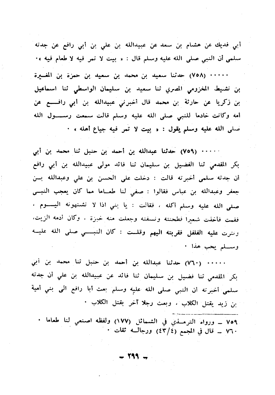 759 - حَدَّثَنَا عَبْدُ اللهِ بْنُ أَحْمَدَ بْنِ حَنْبَلٍ، ثنا مُحَمَّدُ بْنُ أَبِي بَكْرٍ الْمُقَدَّمِيُّ، ثنا الْفُضَيْلُ بْنُ سُلَيْمَانَ، ثنا فَائِدٌ، مَوْلَى عُبَيْدِ اللهِ بْنِ أَبِي رَافِعٍ، أَنَّ جَدَّتَهُ سَلْمَى أَخْبَرَتْهُ، قَالَتْ: دَخَلْتُ عَلَى الْحَسَنِ بْنِ عَلِيٍّ، وَعَبْدِ اللهِ بْنِ جَعْفَرٍ، وَعَبْدِ اللهِ بْنِ عَبَّاسٍ، فَقَالُوا: صِفِي لَنَا طَعَامًا مِمَّا كَانَ يُعْجِبُ النَّبِيَّ صَلَّى اللهُ عَلَيْهِ وَسَلَّمَ أَكْلُهُ، فَقَالَتْ: يَا بَنِيَّ إِذًا لَا تَشْتَهُونَهُ الْيَوْمَ، فَقُمْتُ " فَأَخَذْتُ §شَعِيرًا فَطَحَنَتُهُ، ونَسَفْتُهُ وَجَعَلْتُ مِنْهُ خُبْزَةً وَكَانْ أَدْمَهَ الزَّيْتِ، وَنَثَرْتُ عَلَيْهِ الْفُلْفُلِ فَقَرَّبْتُهُ إِلَيْهِمْ، وَقُلْتُ: كَانَ النَّبِيُّ صَلَّى اللهُ عَلَيْهِ وَسَلَّمَ يُحِبُّ هَذَا "