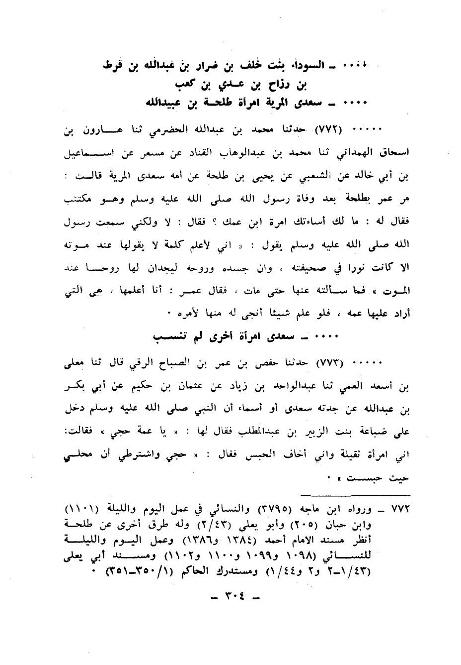 772 - حَدَّثَنَا مُحَمَّدُ بْنُ عَبْدِ اللهِ الْحَضْرَمِيُّ، ثنا هَارُونُ بْنُ إِسْحَاقَ الْهَمْدَانِيُّ، ثنا مُحَمَّدُ بْنُ عَبْدِ الْوَهَّابِ الْقَنَّادُ، عَنْ مِسْعَرٍ، عَنْ إِسْمَاعِيلَ بْنِ أَبِي خَالِدٍ، عَنِ الشَّعْبِيِّ، عَنْ يَحْيَى بْنِ طَلْحَةَ، عَنْ أُمِّهِ سُعْدَى الْمُرِّيَّةِ، قَالَتْ: مَرَّ عُمَرُ بِطَلْحَةَ بَعْدَ وَفَاةِ رَسُولِ اللهِ صَلَّى اللهُ عَلَيْهِ وَسَلَّمَ وَهُوَ مُكْتَئِبٌ، فَقَالَ لَهُ: مَا لَكَ أَسَاءَتْكَ إِمْرَةُ ابْنُ عَمِّكَ؟ فَقَالَ: لَا، وَلَكِنِّي سَمِعْتُ رَسُولَ اللهِ صَلَّى اللهُ عَلَيْهِ وَسَلَّمَ يَقُولُ: «إِنِّي §لَأَعْلَمُ كَلِمَةً لَا يَقُولُهَا عِنْدَ مَوْتِهِ إِلَّا كَانَتْ نُورًا فِي صَحِيفَتِهِ، وَإِنَّ جَسَدَهُ وَرُوحَهُ لَيَجِدَانِ لَهَا رَوْحًا عِنْدَ الْمَوْتِ» فَمَا سَأَلْتُهُ عَنْهَا حَتَّى مَاتَ، فَقَالَ عُمَرُ: أَنَا أَعْلَمُهَا هِيَ الَّتِي أَرَادَ عَلَيْهَا عَمَّهُ فَلَوْ عَلِمَ شَيْئًا أَنْجَى لَهُ مِنْهَا لَأَمَرَهُ