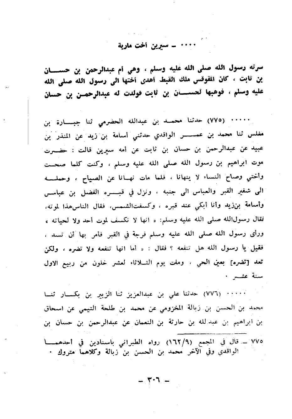 776 - حَدَّثَنَا عَلِيُّ بْنُ عَبْدِ الْعَزِيزِ، ثنا الزُّبَيْرُ بْنُ بَكَّارٍ، ثنا مُحَمَّدُ بْنُ الْحَسَنِ بْنِ زَبَالَةَ الْمَخْزُومِيُّ، عَنْ مُحَمَّدِ بْنِ طَلْحَةَ التَّيْمِيِّ، عَنْ إِسْحَاقَ بْنِ إِبْرَاهِيمَ بْنِ عَبْدِ اللهِ بْنِ حَارِثَةَ بْنِ النُّعْمَانِ، عَنْ عَبْدِ الرَّحْمَنِ بْنِ حَسَّانَ بْنِ ثَابِتٍ، عَنْ أُمِّهِ سِيرِينَ، قَالَتْ: حُضِرَ ابْنُ رَسُولِ اللهِ صَلَّى اللهُ عَلَيْهِ وَسَلَّمَ، فَرَأَيْتُ رَسُولَ اللهِ صَلَّى اللهُ عَلَيْهِ وَسَلَّمَ وَكُلَّمَا صِحْتُ أَنَا وَأُخْتِي نَهَانَا عَنِ الصَّيَّاحِ، وَغَسَّلَهُ الْفَضْلُ بْنُ الْعَبَّاسِ، وَرَسُولُ اللهِ صَلَّى اللهُ عَلَيْهِ وَسَلَّمَ وَالْعَبَّاسُ، وَجُعِلَ عَلَى سَرِيرٍ، ثُمَّ حُمِلَ فَرَأَيْتُهُ جَالِسًا عَلَى شَفِيرِ الْقَبْرِ إِلَى جَنْبِهِ الْعَبَّاسُ بْنُ عَبْدِ الْمُطَّلِبِ، فَنَزَلَ فِي قَبْرِهِ الْفَضْلُ بْنُ عَبَّاسٍ، وَأُسَامَةُ بْنُ زَيْدٍ وَأَنَا أَصِيحُ عِنْدَ الْقَبْرِ وَمَا نَهَانِي أَحَدٌ، وخُسِفَتِ الشَّمْسُ يَوْمَئِذٍ، فَقَالَ: النَّاسُ لِمَوْتِ إِبْرَاهِيمَ، فَقَالَ رَسُولُ اللهِ صَلَّى اللهُ عَلَيْهِ وَسَلَّمَ: «§لَا يُخْسَفُ لِمَوْتِ أَحَدٍ وَلَا لِحَيَاتِهِ» وَرَأَى رَسُولُ اللهِ صَلَّى اللهُ عَلَيْهِ وَسَلَّمَ فُرْجَةً فِي اللَّبَنِ، فَأَمَرَ أَنْ تُسَدَّ فَقَالَ: «إِنَّ الْعَبْدَ إِذَا عَمِلَ عَمَلًا أَحَبَّ اللهُ أَنْ يُتْقِنَهُ» وَمَاتَ يَوْمَ الثُّلَاثَاءِ لِأَرْبَعٍ خَلَوْنَ مِنْ رَبِيعٍ الْأَوَّلِ سَنَةَ عَشْرٍ "