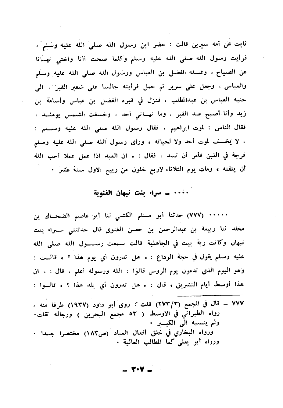 777 - حَدَّثَنَا أَبُو مُسْلِمٍ الْكَشِّيُّ، ثنا أَبُو عَاصِمٍ الضَّحَّاكُ بْنُ مَخْلَدٍ، ثنا رَبِيعَةُ بْنُ عَبْدِ الرَّحْمَنِ بْنِ حِصْنٍ الْغَنَوِيُّ، قَالَ: حَدَّثَتْنِي سَرَّاءُ بِنْتُ نَبْهَانَ، وَكَانَتْ رَبَّةَ بَيْتٍ فِي الْجَاهِلِيَّةِ، قَالَتْ: سَمِعْتُ رَسُولَ اللهِ صَلَّى اللهُ عَلَيْهِ وَسَلَّمَ يَقُولُ: فِي حَجَّةِ الْوَدَاعِ: «هَلْ تَدْرُونَ أَيُّ يَوْمٍ هَذَا؟» قَالَتْ: وَهُوَ الْيَوْمُ الَّذِي تَدْعُونَ يَوْمَ الرُّوسِ، قَالُوا: اللهُ وَرَسُولُهُ أَعْلَمُ، قَالَ: «إِنَّ هَذَا أَوْسَطُ أَيَّامِ التَّشْرِيقِ» قَالَ: «هَلْ تَدْرُونَ أَيُّ بَلَدٍ هَذَا؟» قَالُوا: اللهُ وَرَسُولُهُ أَعْلَمُ قَالَ: «إِنَّ هَذَا الْمَشْعَرُ الْحَرَامُ» ثُمَّ قَالَ: «إِنِّي لَا أَدْرِي لِعَلِّي لَا أَلْقَاكُمْ بَعْدَ هَذَا، أَلَا وَإِنَّ §دِمَاءَكُمْ، وَأَمْوَالَكُمْ، وَأَعْرَاضَكُمْ عَلَيْكُمْ حَرَامٌ كَحُرْمَةِ يَوْمِكُمْ هَذَا فِي بَلَدِكُمْ هَذَا، حَتَّى تَلْقَوْا رَبَّكُمْ فَيَسْأَلُكُمْ عَنْ أَعْمَالِكُمْ، أَلَا فَلْيُبَلِّغْ أَدْنَاكُمْ أَقْصاكُمْ، أَلَا هَلْ بَلَّغْتُ» فَلَمَّا قَدِمَ الْمَدِينَةَ لَمْ يَلْبَثْ إِلَّا قَلِيلًا حَتَّى مَاتَ