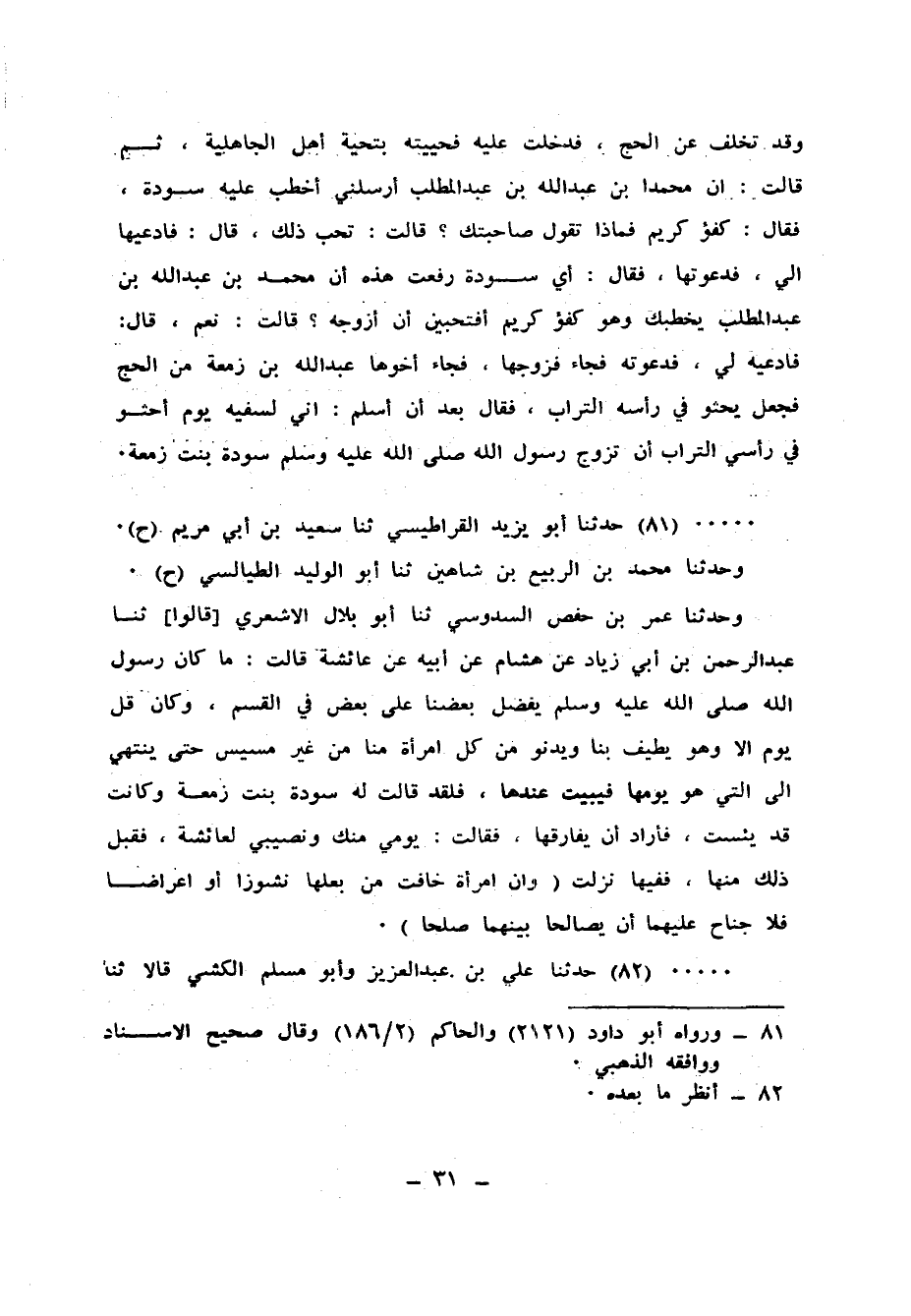 81 - حَدَّثَنَا أَبُو يَزِيدَ الْقَرَاطِيسِيُّ، ثنا سَعِيدُ بْنُ أَبِي مَرْيَمَ، ح وَحَدَّثَنَا مُحَمَّدُ بْنُ الرَّبِيعِ بْنِ شَاهِينٍ، ثنا أَبُو الْوَلِيدِ الطَّيَالِسِيُّ، ح وَحَدَّثَنَا عُمَرُ بْنُ حَفْصٍ السَّدُوسِيُّ، ثنا أَبُو بِلَالٍ الْأَشْعَرِيُّ، قَالُوا: ثنا عَبْدُ الرَّحْمَنِ بْنُ أَبِي زِيَادٍ، عَنْ هِشَامٍ، عَنْ أَبِيهِ، عَنْ عَائِشَةَ، قَالَتْ: " §مَا كَانَ رَسُولُ اللهِ صَلَّى اللهُ عَلَيْهِ وَسَلَّمَ يُفَضِّلُ بَعْضَنَا عَلَى بَعْضٍ فِي الْقَسْمِ، وَكَانَ قَلَّ يَوْمٌ إِلَّا وَهُوَ يُطِيفُ بِنَا وَيَدْنُو مِنْ كُلِّ امْرَأَةٍ مِنَّا مِنْ غَيْرِ مَسِيسٍ حَتَّى يَنْتَهِيَ إِلَى الَّتِي هُوَ يَوْمُهَا فَيَبِيتُ عِنْدَهَا، فَلَقَدْ قَالَتْ لَهُ سَوْدَةُ بِنْتُ زَمْعَةَ وَكَانَتْ قَدْ يَئِسَتْ فَأَرَادَ أَنْ يُفَارِقَهَا فَقَالَتْ: يَوْمِي مِنْكَ وَنَصِيبِي لِعَائِشَةَ فَقَبِلَ ذَلِكَ مِنْهَا "، فَفِيهَا نَزَلَتْ: {وَإِنِ امْرَأَةٌ خَافَتْ مِنْ بَعْلِهَا نُشُوزًا أَوْ إِعْرَاضًا فَلَا جُنَاحَ عَلَيْهِمَا أَنْ يُصْلِحَا بَيْنَهُمَا صُلْحًا} [النساء: 128]