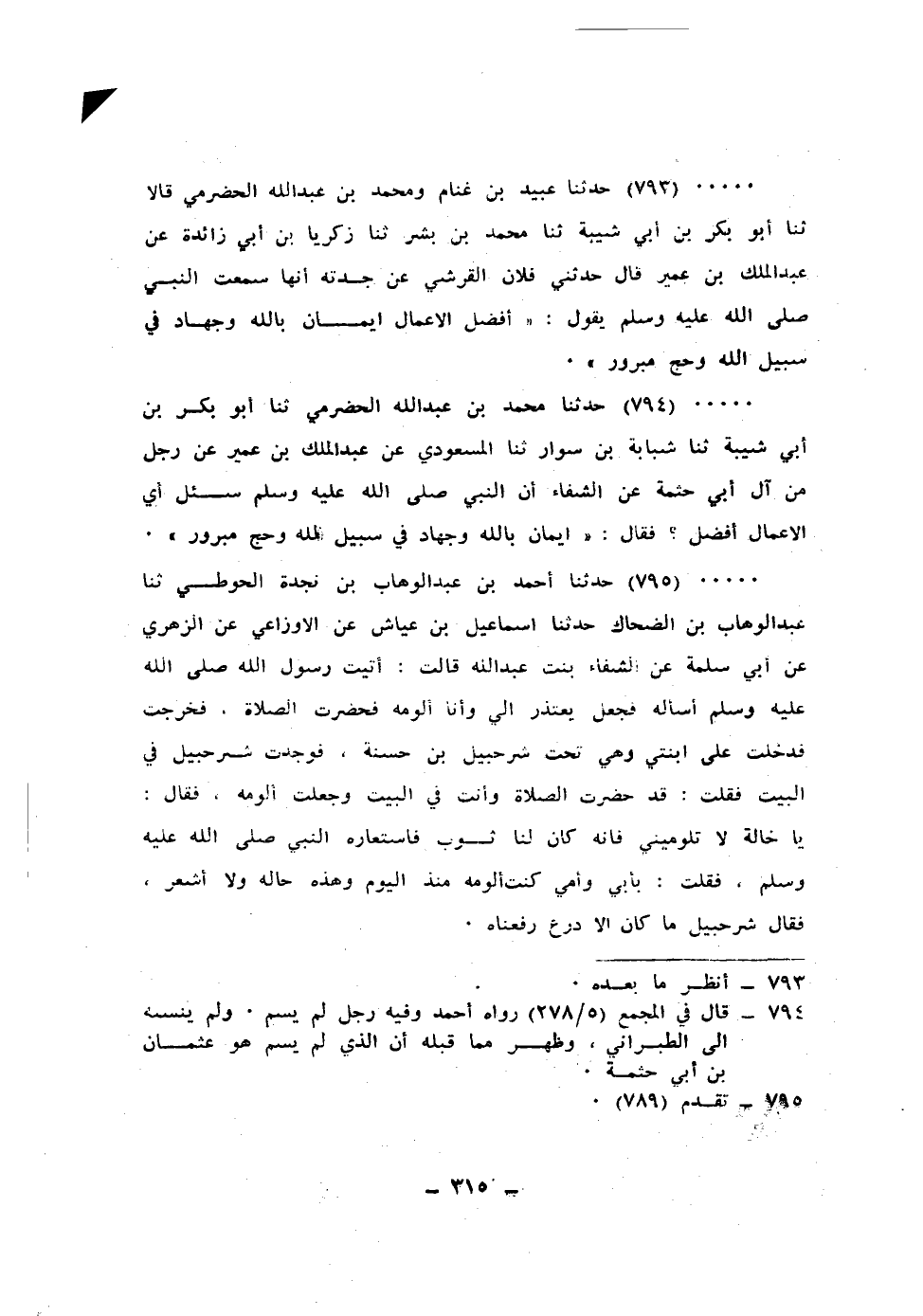 794 - حَدَّثَنَا مُحَمَّدُ بْنُ عَبْدِ اللهِ الْحَضْرَمِيُّ، ثنا أَبُو بَكْرِ بْنُ أَبِي شَيْبَةَ، ثنا شَبَابَةُ بْنُ سَوَّارٍ، ثنا الْمَسْعُودِيُّ، عَنْ عَبْدِ الْمَلِكِ بْنِ عُمَيْرٍ، عَنْ رَجُلٍ، مِنْ آلِ أَبِي حَثْمَةَ، عَنِ الشِّفَاءِ، أَنَّ النَّبِيَّ صَلَّى اللهُ عَلَيْهِ وَسَلَّمَ سُئِلَ: §أَيُّ الْأَعْمَالِ أَفْضَلُ؟ فَقَالَ: «إِيمَانٌ بِاللهِ، وَجِهَادٌ فِي سَبِيلِ اللهِ، وَحَجٌّ مَبْرُورٌ»