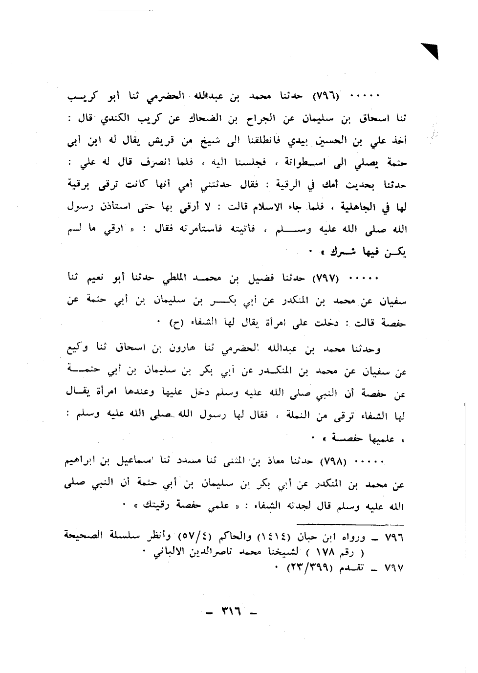 797 - حَدَّثَنَا فُضَيْلُ بْنُ مُحَمَّدٍ الْمَلْطِيُّ، حَدَّثَنَا أَبُو نُعَيْمٍ، ثنا سُفْيَانُ، عَنْ مُحَمَّدِ بْنِ الْمُنْكَدِرِ، عَنْ أَبِي بَكْرِ بْنِ سُلَيْمَانَ بْنِ أَبِي حَثْمَةَ، عَنْ حَفْصَةَ، قَالَتْ: دَخَلْتُ عَلَى امْرَأَةٍ يُقَالُ لَهَا الشِّفَاءُ، ح. وَحَدَّثَنَا مُحَمَّدُ بْنُ عَبْدِ اللهِ الْحَضْرَمِيُّ، ثنا هَارُونُ بْنُ إِسْحَاقَ، ثنا وَكِيعٌ، عَنْ سُفْيَانَ، عَنْ مُحَمَّدِ بْنِ الْمُنْكَدِرِ، عَنْ أَبِي بَكْرِ بْنِ سُلَيْمَانَ بْنِ أَبِي حَثْمَةَ، عَنْ حَفْصَةَ، أَنَّ النَّبِيَّ صَلَّى اللهُ عَلَيْهِ وَسَلَّمَ دَخَلَ عَلَيْهَا وَعِنْدَهَا امْرَأَةٌ يُقَالُ لَهَا الشِّفَاءُ §تَرْقِي مِنَ النَّمْلَةِ، فَقَالَ لَهَا رَسُولُ اللهِ صَلَّى اللهُ عَلَيْهِ وَسَلَّمَ: «عَلِّمِيهَا حَفْصَةَ»