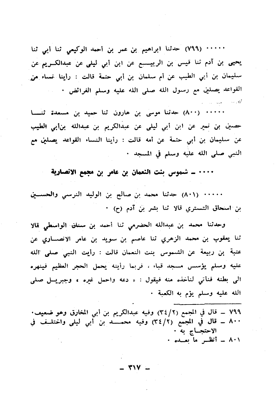 800 - حَدَّثَنَا مُوسَى بْنُ هَارُونَ، ثنا حُمَيْدُ بْنُ مَسْعَدَةَ، ثنا حُصَيْنُ بْنُ نُمَيْرٍ، عَنِ ابْنِ أَبِي لَيْلَى، عَنْ عَبْدِ الْكَرِيمِ بْنِ عَبْدِ اللهِ بْنِ أَبِي الطَّيِّبِ، عَنْ سُلَيْمَانَ بْنِ أَبِي حَثْمَةَ، عَنْ أُمِّهِ، قَالَتْ: «رَأَيْنَا §النِّسَاءَ الْقَوَاعِدَ يُصَلِّينَ مَعَ النَّبِيِّ صَلَّى اللهُ عَلَيْهِ وَسَلَّمَ فِي الْمَسْجِدِ»
