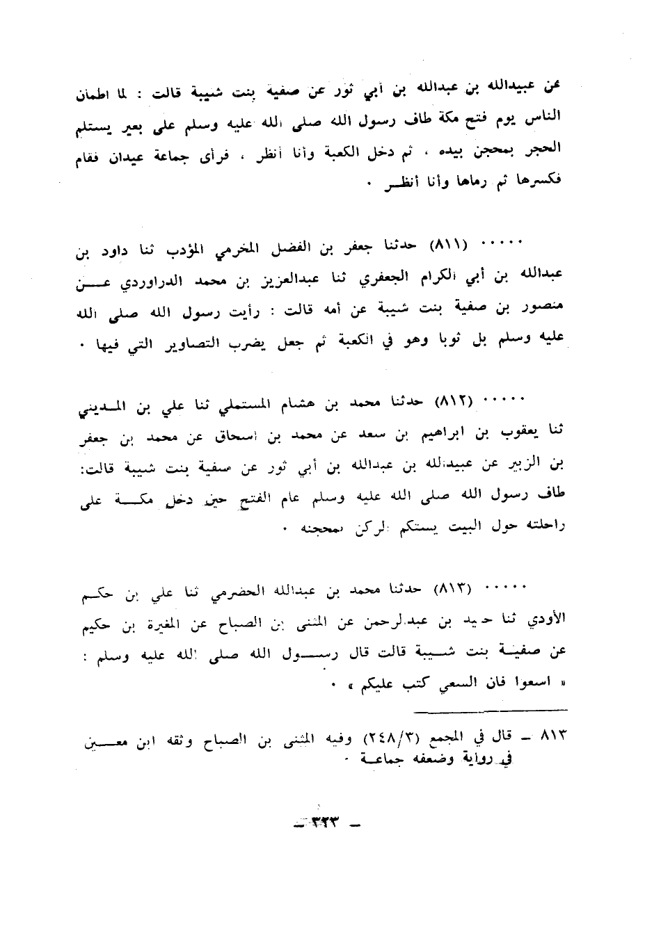 813 - حَدَّثَنَا مُحَمَّدُ بْنُ عَبْدِ اللهِ الْحَضْرَمِيُّ، ثنا عَلِيُّ بْنُ حَكَمٍ الْأَوْدِيُّ، ثنا حُمَيْدُ بْنُ عَبْدِ الرَّحْمَنِ، عَنِ الْمُثَنَّى بْنِ الصَّبَّاحِ، عَنِ الْمُغِيرَةِ بْنِ حَكِيمٍ، عَنْ صَفِيَّةَ بِنْتِ شَيْبَةَ، قَالَتْ: قَالَ رَسُولُ اللهِ صَلَّى اللهُ عَلَيْهِ وَسَلَّمَ: «§اسْعَوْا فَإِنَّ السَّعْيَ كُتِبَ عَلَيْكُمْ»