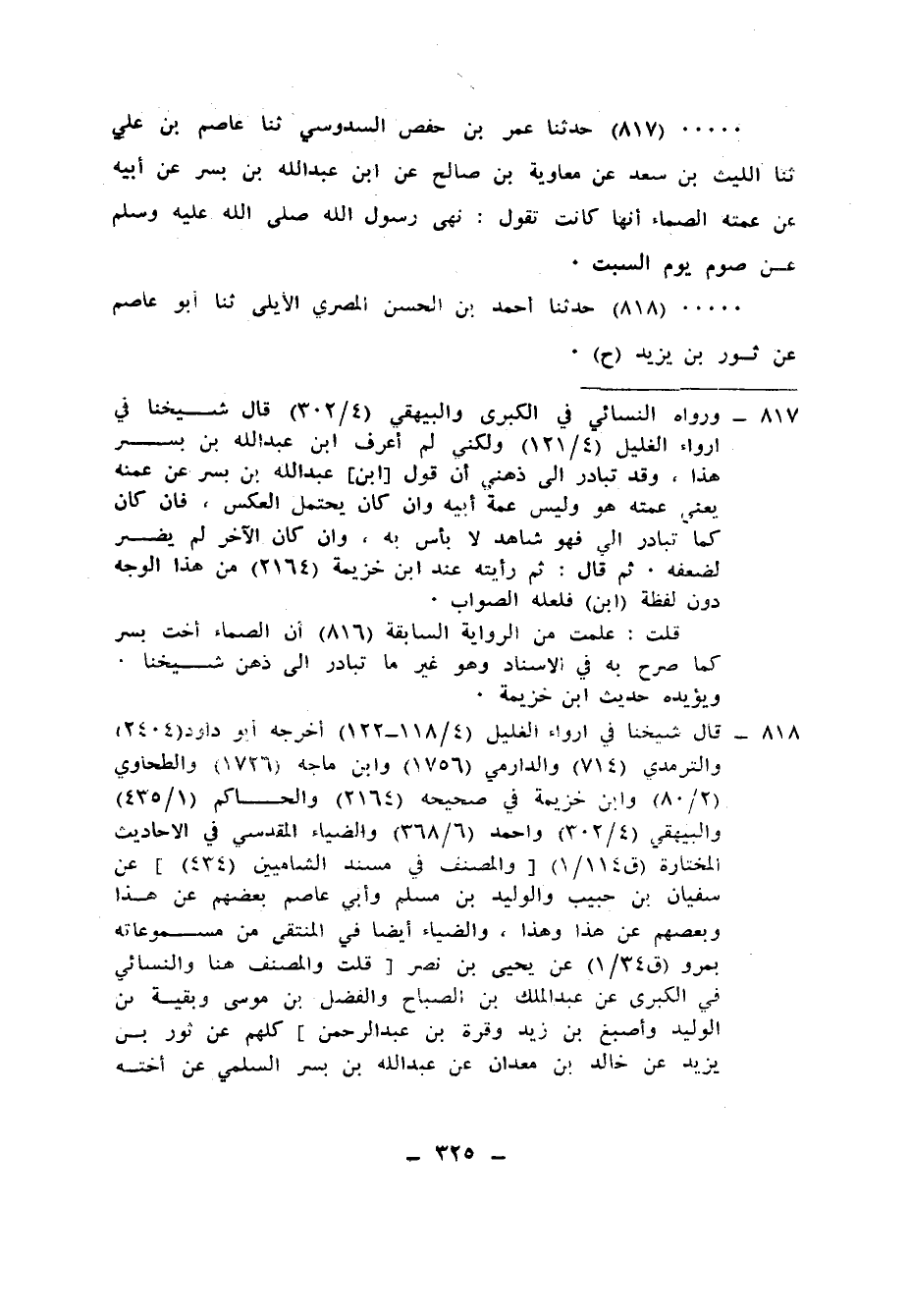 817 - حَدَّثَنَا عُمَرُ بْنُ حَفْصٍ السَّدُوسِيُّ، ثنا عَاصِمُ بْنُ عَلِيٍّ، ثنا اللَّيْثُ بْنُ سَعْدٍ، عَنْ مُعَاوِيَةَ بْنِ صَالِحٍ، عَنِ ابْنِ عَبْدِ اللهِ بْنِ بُسْرٍ، عَنْ أَبِيهِ، عَنْ عَمَّتِهِ الصَّمَّاءِ، أَنَّهَا كَانَتْ تَقُولُ: «§نَهَى رَسُولُ اللهِ صَلَّى اللهُ عَلَيْهِ وَسَلَّمَ عَنْ صَوْمِ يَوْمِ السَّبْتِ»