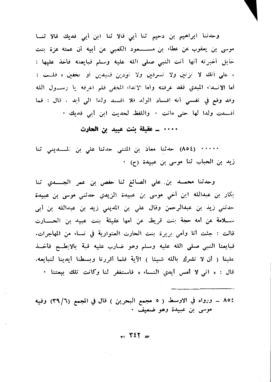 854 - حَدَّثَنَا مُعَاذُ بْنُ الْمُثَنَّى، حَدَّثَنَا عَلِيُّ بْنُ الْمَدِينِيِّ، ثنا زَيْدُ بْنُ الْحُبَابِ، ثنا مُوسَى بْنُ عُبَيْدَةَ، ح وَحَدَّثَنَا مُحَمَّدُ بْنُ عَلِيٍّ الصَّائِغُ، ثنا حَفْصُ بْنُ عُمَرَ الْجُدِّيُّ، ثنا بَكَّارُ بْنُ عَبْدِ اللهِ ابْنِ أَخِي مُوسَى بْنِ عُبَيْدَةَ الزَّيْدِيُّ، حَدَّثَنِي مُوسَى بْنُ عُبَيْدَةَ، حَدَّثَنِي زَيْدُ بْنُ عَبْدِ الرَّحْمَنِ، وَقَالَ عَلِيُّ بْنُ الْمَدِينِيِّ: زَيْدُ بْنُ عَبْدِ اللهِ بْنِ أَبِي سَلَامَةَ، عَنْ أُمِّهِ حَجَّةَ بِنْتِ قُرَيْظٍ، عَنْ أُمِّهَا عَقِيلَةَ بِنْتَ عُبَيْدِ بْنِ الْحَارِثِ، قَالَتْ: جِئْتُ أَنَا وَأُمِّي بَرِيرَةُ بِنْتُ الْحَارِثِ الْعَتْوَارِيَّةُ، فِي نِسَاءٍ مِنَ الْمُهَاجِرَاتِ فَبَايَعْنَا النَّبِيَّ صَلَّى اللهُ عَلَيْهِ وَسَلَّمَ وَهُوَ ضاربٌ عَلَيْهِ قُبَّةً بِالْأَبْطَحِ فَأَخَذَ عَلَيْنَا أَنْ لَا نُشْرِكَ بِاللهِ شَيْئًا، الْآيَةَ، فَلَمَّا أَقْرَرْنا وبَسَطْنا أَيْدِينَا لِنُبَايِعَهُ قَالَ: «§إِنِّي لَا أَمَسُّ أَيْدِي النِّسَاءِ» فَاسْتَغْفَرَ لَنَا وَكَانَتْ تِلْكَ بِيعَتَنَا