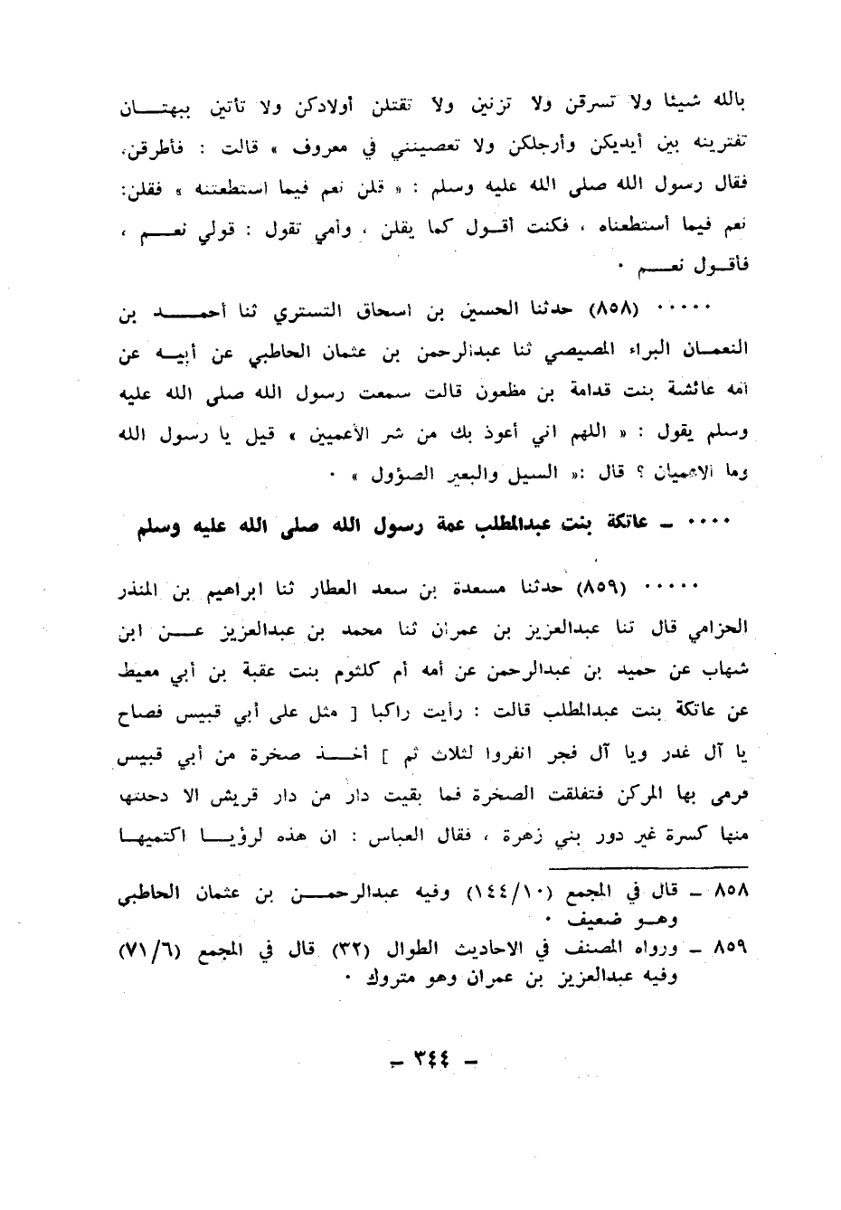 858 - حَدَّثَنَا الْحُسَيْنُ بْنُ إِسْحَاقَ التُّسْتَرِيُّ، ثنا أَحْمَدُ بْنُ النُّعْمَانِ الْبَرَاءُ الْمِصِّيصِيُّ، ثنا عَبْدُ الرَّحْمَنِ بْنُ عُثْمَانَ الْحَاطِبِيُّ، عَنْ أَبِيهِ، عَنْ أُمِّهِ عَائِشَةَ بِنْتِ قُدَامَةَ بْنِ مَظْعُونٍ، قَالَتْ: سَمِعْتُ رَسُولَ اللهِ صَلَّى اللهُ عَلَيْهِ وَسَلَّمَ يَقُولُ: «§اللهُمَّ إِنِّي أَعُوذُ بِكَ مِنْ شَرِّ الْأَعْمَيَيْنِ» قِيلَ: يَا رَسُولَ اللهِ، وَمَا الْأَعْمَيانِ؟ قَالَ: «السَّيْلُ، وَالْبَعِيرُ الصَّؤُولُ»