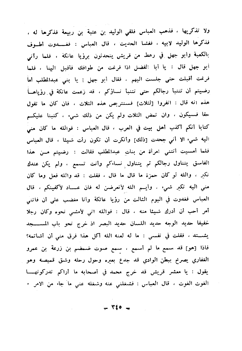 فَإِنْ كَانَ مَا تَقُولُ حَقًّا فَسَيَكُونُ ، وَإِنْ تَمْضِ الثَّلاَثُ ، وَلَمْ يَكُنْ مِنْ ذَلِكَ شَيْءٌ كَتَبْنَا عَلَيْكُمْ كِتَابًا أَنَّكُمْ أَكْذَبُ أَهْلِ بَيْتٍ فِي الْعَرَبِ ، قَالَ الْعَبَّاسُ : فَوَاللَّهِ مَا كَانَ مِنِّي إِلَيْهِ شَيْءٌ إِلاَّ أَنِّي جَحَدْتُ ذَلِكَ ، وَأَنْكَرْتُ أَنْ تَكُونَ رَأَتْ شَيْئًا ، قَالَ الْعَبَّاسُ : فَلَمَّا أَمْسَيْتُ أَتَتْنِي امْرَأَةٌ مِنْ بَنَاتِ عَبْدِ الْمُطَّلِبِ ، فَقَالَتْ : رَضِيتُمْ مِنْ هَذَا الْفَاسِقِ يَتَنَاوَلُ رِجَالَكُمْ ، ثُمَّ يَتَنَاوَلُ نِسَاءَكُمْ ، وَأَنْتَ تَسْمَعُ ، وَلَمْ يَكُنْ عِنْدَكَ نَكِيرٌ ، وَاللَّهِ لَوْ كَانَ حَمْزَةُ مَا قَالَ مَا قَالَ ، فَقُلْتُ : قَدْ وَاللَّهِ فَعَلَ ، وَمَا كَانَ مِنِّي إِلَيْهِ نَكِيرُ شَيْءٍ ، وَأَيْمُ اللهِ ، لأَتَعَرَّضْنَ لَهُ ، فَإِنْ عَادَ لأَكْفِينَكُمْ ، قَالَ الْعَبَّاسُ : فَغَدَوْتُ فِي الْيَوْمِ الثَّالِثِ مِنْ رُؤْيَا عَاتِكَةَ ، وَأَنَا مُغْضَبٌ ، عَلَى أَنْ فَاتَنِي أَمَرٌ أَحَبُّ أَنْ أُدْرِكَ شَيْئًا مِنْهُ ، قَالَ : فَوَاللَّهِ إِنِّي لأَمْشِي نَحْوَهُ ، وَكَانَ رَجُلاً خَفِيفًا ، حَدِيدَ الْوَجْهِ ، حَدِيدَ اللِّسَانِ ، حَدِيدَ الْبَصَرِ ، إِذْ خَرَجَ نَحْوَ بَابِ الْمَسْجِدِ يَشْتَدُّ ، فَقُلْتُ فِي نَفْسِي : مَا لَهُ لَعَنَهُ اللَّهُ ، أَكُلُّ هَذَا فَرَقٌ مِنِّي أَنْ أُشَاتِمَهُ ، فَإِذَا هُوَ قَدْ سَمِعَ مَا لَمْ أَسْمَعْ سَمِعَ صَوْتَ ضَمْضَمِ بْنِ زُرْعَةَ بْنِ عَمْرٍو الْغِفَارِيِّ يَصْرُخُ بِبَطْنِ الْوَادِي قَدْ جَدَعَ بَعِيرَهُ ، وَحَوَّلَ رَحْلَهُ ، وَشَقَّ قَمِيصَهُ وَهُوَ يَقُولُ : يَا مَعْشَرَ قُرَيْشٍ قَدْ خَرَجَ مُحَمَّدٌ فِي أَصْحَابِهِ ، مَا أَرَاكُمْ تُدْرِكُونَها الْغَوْثَ الْغَوْثَ ، قَالَ الْعَبَّاسُ : فَشَغَلَنِي عَنْهُ وشَغَلَهُ عَنِّي مَا جَاءَ مِنَ الأَمْرِ.