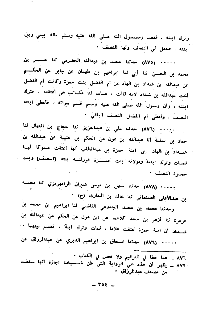 876 - حَدَّثَنَا عَلِيُّ بْنُ عَبْدِ الْعَزِيزِ، ثنا حَجَّاجُ بْنُ الْمِنْهَالِ، ثنا حَمَّادُ بْنُ سَلَمَةَ، أَنَا عَبْدُ اللهِ بْنُ عَوْنٍ، عَنِ الْحَكَمِ بْنِ عُتَيْبَةَ، عَنْ عَبْدِ اللهِ بْنِ شَدَّادِ بْنِ الْهَادِ ابْنِ ابْنَةِ حَمْزَةَ بْنِ عَبْدِ الْمُطَّلِبِ، «أَنَّهَا §أَعْتَقَتْ مَمْلُوكًا لَهَا، فَمَاتَ وَتَرَكَ ابْنَتَهُ وَمَوْلَاتَهُ بِنْتَ حَمْزَةَ، فَوَرِثَتْهُ بِنْتَهُ النِّصْفَ، وَبِنْتَ حَمْزَةَ النِّصْفَ»