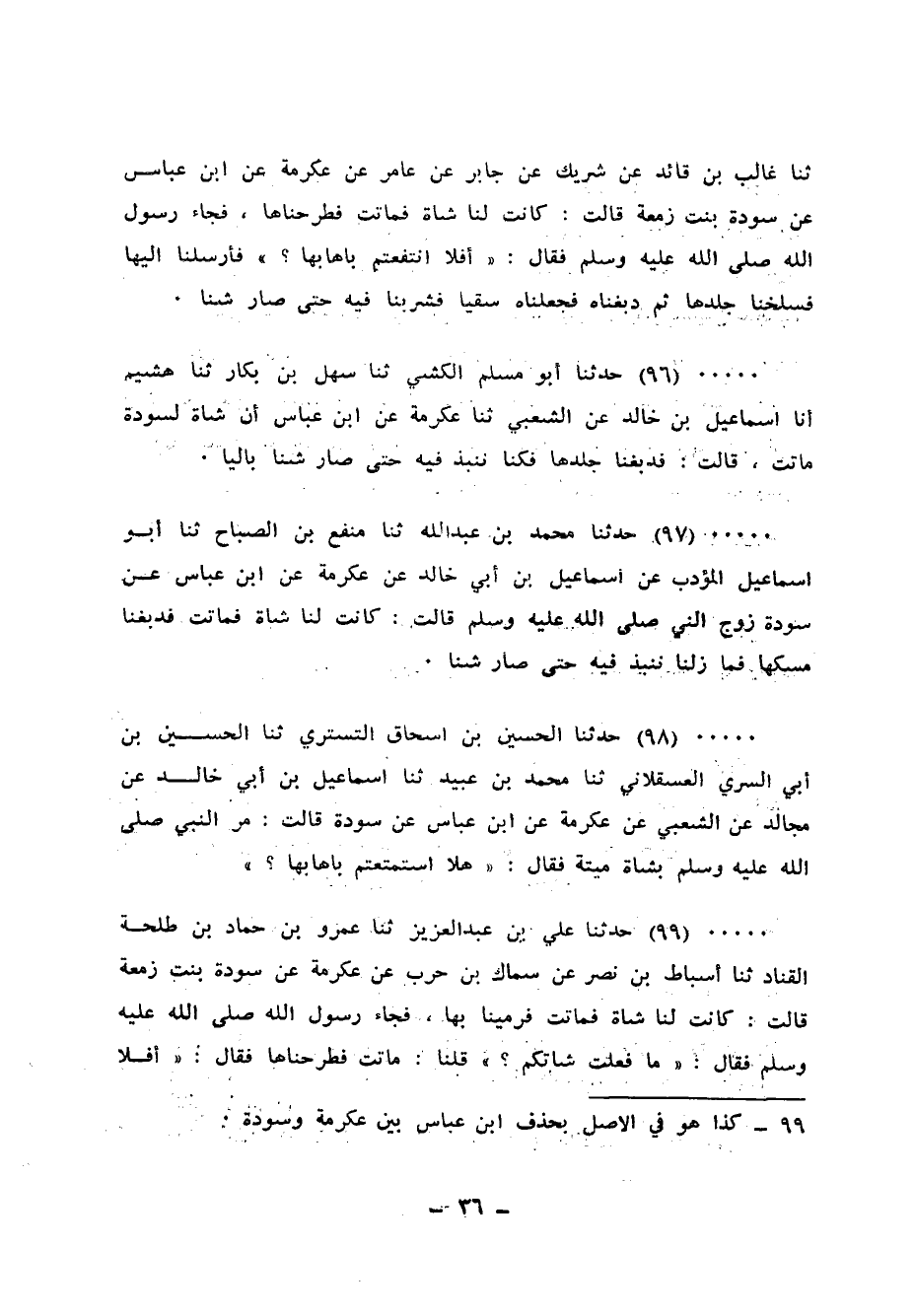 96 - حَدَّثَنَا أَبُو مُسْلِمٍ الْكَشِّيُّ، ثنا سَهْلُ بْنُ بَكَّارٍ، ثنا هُشَيْمٌ، أَنَا إِسْمَاعِيلُ بْنُ خَالِدٍ، عَنِ الشَّعْبِيِّ، ثنا عِكْرِمَةُ، عَنِ ابْنِ عَبَّاسٍ، أَنَّ شَاةً لِسَوْدَةَ مَاتَتْ، قَالَتْ: «§فَدَبَغْنَا جِلْدَهَا فَكُنَّا نَنْبِذُ فِيهِ حَتَّى صَارَ شَنًّا بَالِيًا»
