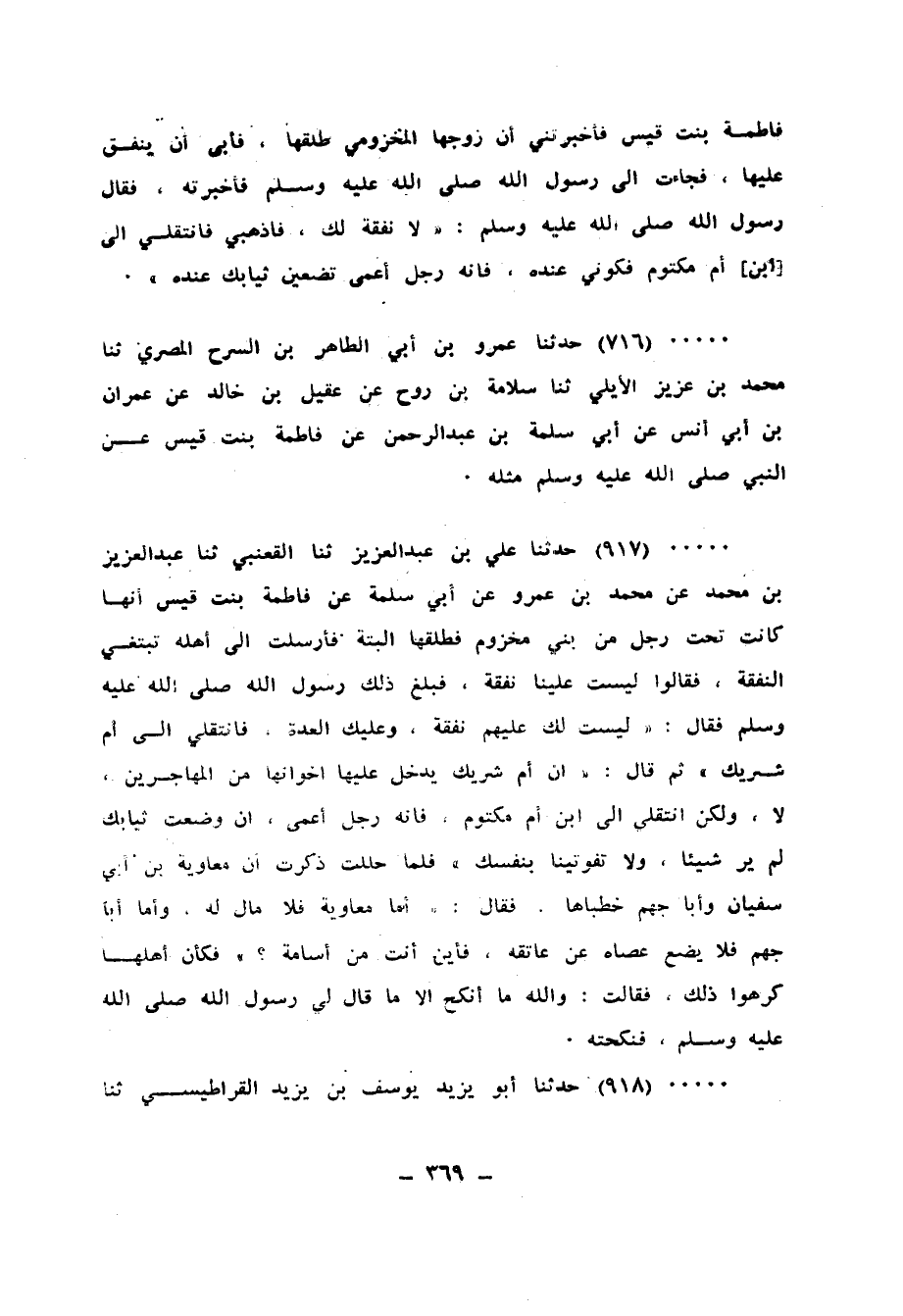 918 - حَدَّثَنَا أَبُو يَزِيدَ يُوسُفُ بْنُ يَزِيدَ الْقَرَاطِيسِيُّ، ثنا حَجَّاجُ بْنُ إِبْرَاهِيمَ الْأَزْرَقُ، ح وَحَدَّثَنَا يُوسُفُ، ثنا أَبُو الرَّبِيعِ الزَّهْرَانِيُّ قَالَا: ثنا إِسْمَاعِيلُ بْنُ جَعْفَرٍ، عَنْ مُحَمَّدِ بْنِ عَمْرٍو، عَنْ أَبِي سَلَمَةَ، عَنْ فَاطِمَةَ بِنْتِ قَيْسٍ، أَنَّهَا كَانَتْ تَحْتَ رَجُلٍ مِنْ بَنِي مَخْزُومٍ، فَطَلَّقَهَا ألْبَتَّةَ، فَأَرْسَلَتْ إِلَى أَهْلِهِ تَبْتَغِي النَّفَقَةَ، فَقَالُوا: لَيْسَ لَكِ عَلَيْنَا نَفَقَةٌ، فَبَلَغَ ذَلِكَ رَسُولُ اللهِ صَلَّى اللهُ عَلَيْهِ وَسَلَّمَ فَقَالَ: «§لَيْسَ لَكِ عَلَيْهِمْ نَفَقَةٌ، وَعَلَيْكِ الْعِدَّةُ، فَانْتَقِلِي إِلَى أُمِّ شَرِيكٍ» ثُمَّ قَالَ: «إِنَّ أُمَّ شَرِيكٍ يَدْخُلُ عَلَيْهَا إِخْوَتُهَا مِنَ الْمُهَاجِرِينَ الْأَوَّلِينَ، انْتَقِلِي إِلَى ابْنِ أُمِّ مَكْتُومٍ، فَإِنَّهُ رَجُلٌ أَعْمَى إِنْ وَضَعْتِ ثِيَابَكِ لَمْ يَرَ شَيْئًا، فَلَا تُفَوِّتِينَا بِنَفْسِكِ» فَلَمَّا حَلَّتْ ذَكَرَهَا رِجَالٌ، فَقَالَ النَّبِيُّ صَلَّى اللهُ عَلَيْهِ وَسَلَّمَ: «أَيْنَ أَنْتِ مِنْ أُسَامَةَ؟» وَكَأَنَّ أَهْلَهَا كَرِهُوا ذَلِكَ، فَقَالَتْ: وَاللهِ لَا أَنْكِحُ إِلَّا الَّذِي قَالَ رَسُولُ اللهِ صَلَّى اللهُ عَلَيْهِ وَسَلَّمَ، فَنَكَحَتْهُ