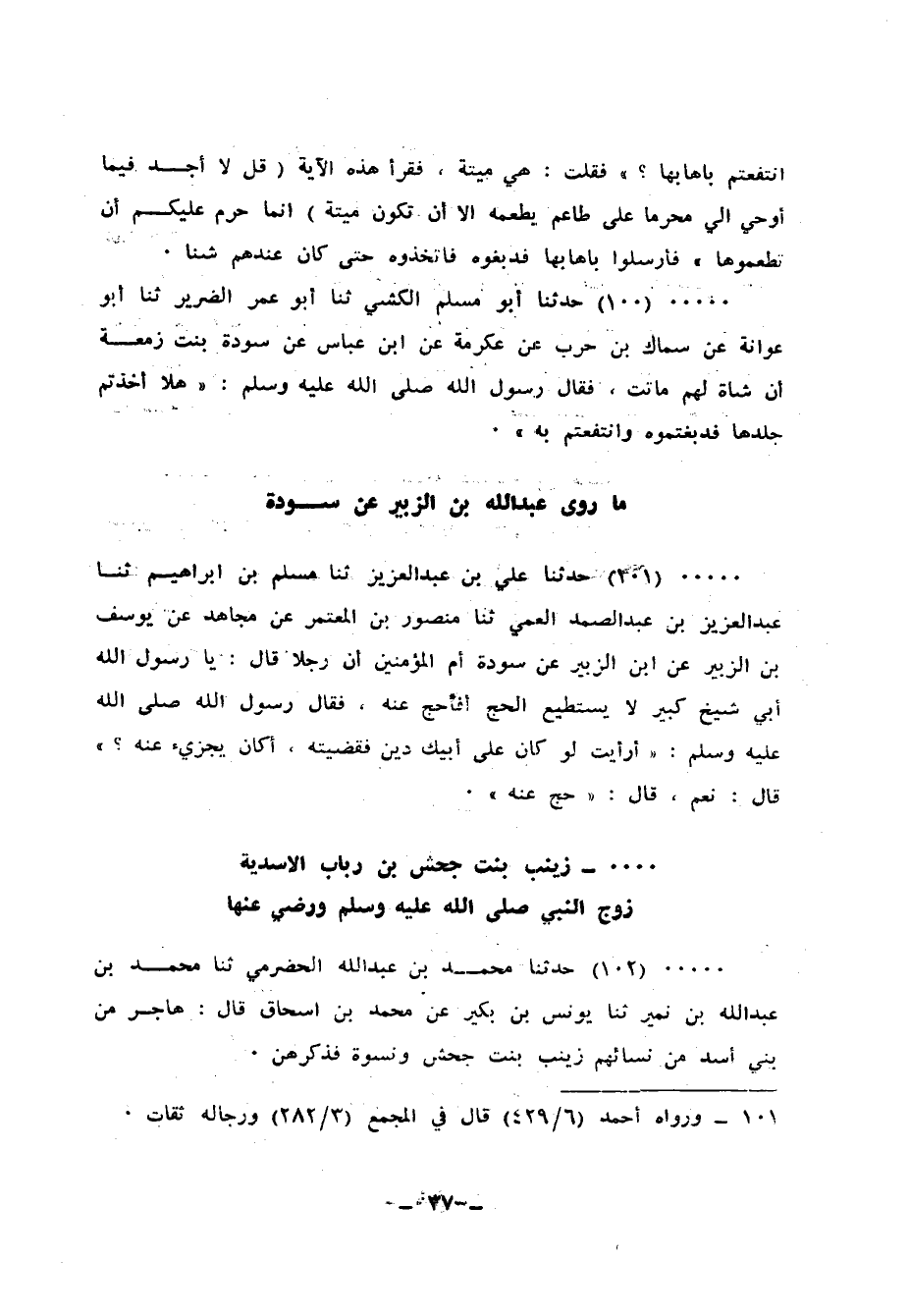 102 - حَدَّثَنَا مُحَمَّدُ بْنُ عَبْدِ اللهِ الْحَضْرَمِيُّ، ثنا مُحَمَّدُ بْنُ عَبْدِ اللهِ بْنِ نُمَيْرٍ، ثنا يُونُسُ بْنُ بُكَيْرٍ، عَنْ مُحَمَّدِ بْنِ إِسْحَاقَ، قَالَ: «§هَاجَرَ مِنْ بَنِي أَسَدٍ مِنْ نِسَائِهِمْ زَيْنَبُ بِنْتُ جَحْشٍ وَنِسْوَةٌ» فَذَكَّرَهُنَّ