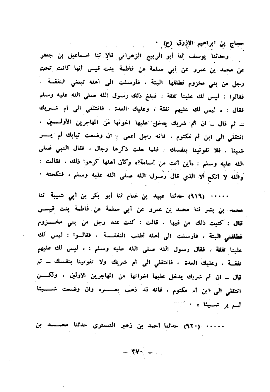 919 - حَدَّثَنَا عُبَيْدُ بْنُ غَنَّامٍ، ثنا أَبُو بَكْرِ بْنُ أَبِي شَيْبَةَ، ثنا مُحَمَّدُ بْنُ بِشْرٍ، ثنا مُحَمَّدُ بْنُ عَمْرٍو، عَنْ أَبِي سَلَمَةَ، عَنْ فَاطِمَةَ بِنْتِ قَيْسٍ، قَالَ: كَتَبْتُ ذَلِكَ مِنْ فِيهَا قَالَتْ: كُنْتُ عِنْدَ رَجُلٍ مِنْ بَنِي مَخْزُومٍ فَطَلَّقَنِي ألْبَتَّةَ، فَأَرْسَلْتُ إِلَى أَهْلِهِ أَطْلُبُ النَّفَقَةَ، فَقَالُوا: لَيْسَ لَكِ عَلَيْنَا نَفَقَةٌ، فَقَالَ رَسُولُ اللهِ صَلَّى اللهُ عَلَيْهِ وَسَلَّمَ: «§لَيْسَ لَكِ عَلَيْهِمْ نَفَقَةٌ، وَعَلَيْكِ الْعِدَّةُ، فَانْتَقِلِي إِلَى أُمِّ شَرِيكٍ، وَلَا تُفَوِّتِينَا بِنَفْسِكِ» ثُمَّ قَالَ: «إِنَّ أُمَّ شَرِيكٍ يَدْخُلُ عَلَيْهَا إِخْوَانُهَا مِنَ الْمُهَاجِرِينَ الْأَوَّلِينَ، وَلَكِنِ انْتَقِلِي إِلَى ابْنِ أُمِّ مَكْتُومٍ فَإِنَّهُ قَدْ ذَهَبَ بَصَرُهُ، وَإِنْ وَضَعْتِ شَيْئًا لَمْ يَرَ شَيْئًا»