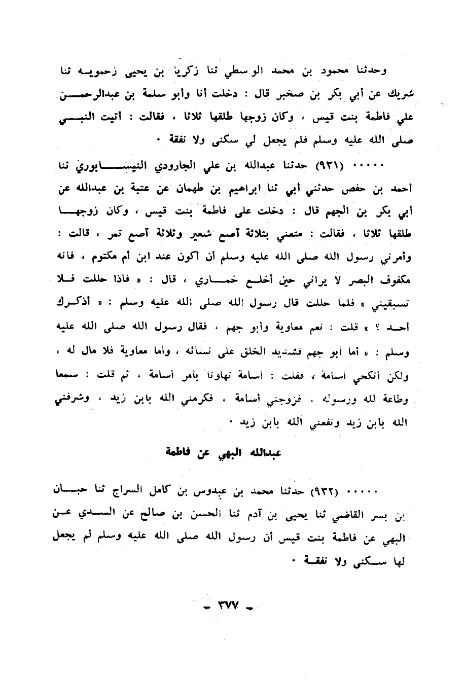 931 - حَدَّثَنَا عَبْدُ اللهِ بْنُ عَلِيٍّ الْجَارُودِيُّ النَّيْسَابُورِيُّ، ثنا أَحْمَدُ بْنُ حَفْصٍ، حَدَّثَنِي أَبِي، ثنا إِبْرَاهِيمُ بْنُ طَهْمَانَ، عَنْ عُتْبَةَ بْنِ عَبْدِ اللهِ، عَنْ أَبِي بَكْرِ بْنِ الْجَهْمِ، قَالَ: دَخَلْتُ عَلَى فَاطِمَةَ بِنْتِ قَيْسٍ وَكَانَ زَوْجُهَا طَلَّقَهَا ثَلَاثًا، فَقَالَتْ: مَتَّعَنِي بِثَلَاثَةِ آصُعٍ شَعِيرٍ، وَثَلَاثَةِ آصُعٍ تَمْرٍ، قَالَتْ: §وَأَمَرَنِي رَسُولُ اللهِ صَلَّى اللهُ عَلَيْهِ وَسَلَّمَ أَنْ أَكُونَ عِنْدَ ابْنِ أُمِّ مَكْتُومٍ فَإِنَّهُ مَكْفُوفُ الْبَصَرِ لَا يَرَانِي حِينَ اخْلَعُ خِمَارِي، قَالَ: «فَإِذَا حَلَلْتِ فَلَا تَسْبِقِينِي» فَلَمَّا حَلَلْتُ، قَالَ رَسُولُ اللهِ صَلَّى اللهُ عَلَيْهِ وَسَلَّمَ: «أَذَكَرَكِ أَحَدٌ؟» قُلْتُ: نَعَمْ، مُعَاوِيَةُ، وَأَبُو جَهْمٍ، فَقَالَ رَسُولُ اللهِ صَلَّى اللهُ عَلَيْهِ وَسَلَّمَ: «أَمَّا أَبُو جَهْمٍ، فَشَدِيدُ الْخُلُقِ عَلَى نِسَائِهِ، وَأَمَّا مُعَاوِيَةُ فَلَا مَالَ لَهُ، وَلَكِنِ انْكِحِي أُسَامَةَ» ، فَقُلْتُ: أُسَامَةُ - تَهَاوُنًا بِأَمْرِ أُسَامَةَ - ثُمَّ قُلْتُ: سَمْعًا وَطَاعَةً لِلَّهِ وَرَسُولِهِ، فَزَوَّجَنِي أُسَامَةَ «فَكَرَمَنِي اللهُ بِابْنِ زَيْدٍ، وشَرَّفَنِي اللهُ بِابْنِ زَيْدٍ، ونَفَعَنِي اللهُ بِابْنِ زَيْدٍ»