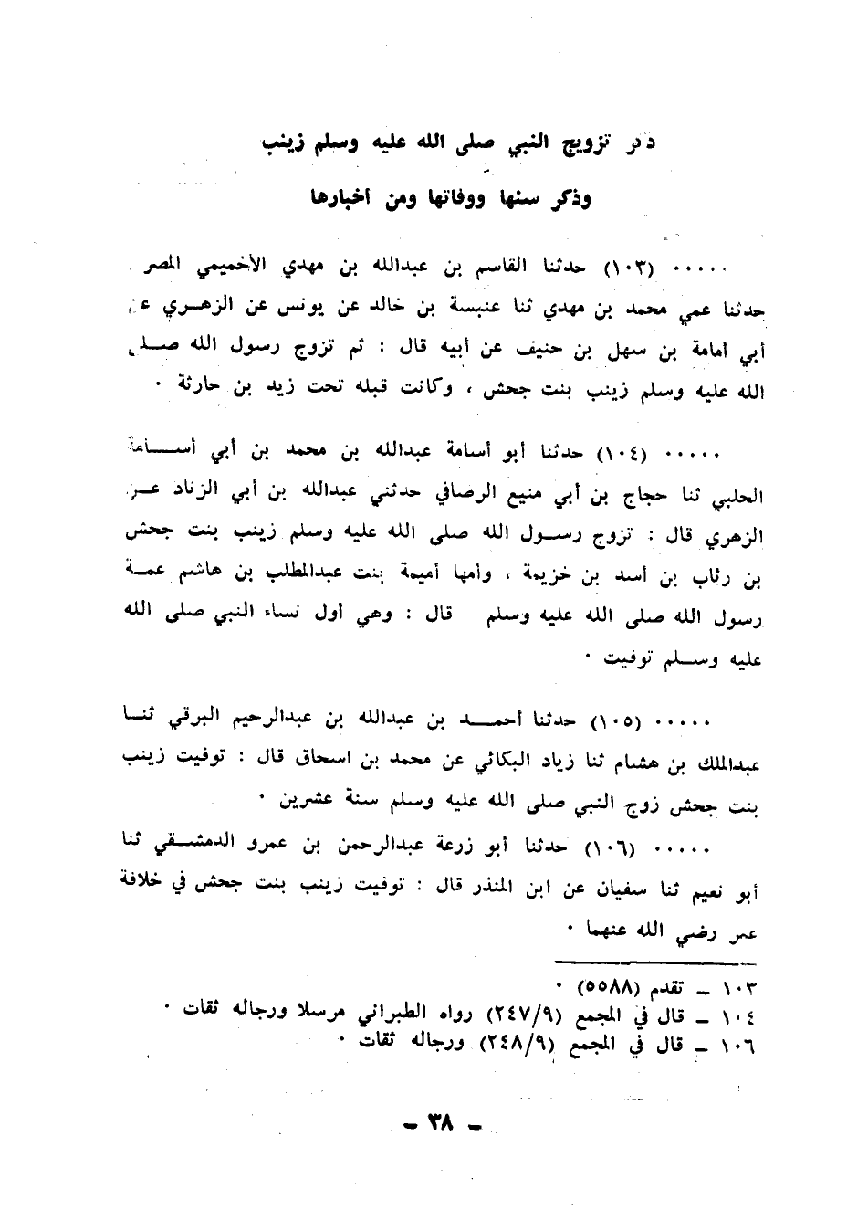 104 - حَدَّثَنَا أَبُو أُسَامَةَ عَبْدُ اللهِ بْنُ مُحَمَّدِ بْنِ أَبِي أُسَامَةَ الْحَلَبِيُّ، ثنا حَجَّاجُ بْنُ أَبِي مَنِيعٍ الرُّصَافِيُّ، حَدَّثَنِي عَبْدُ اللهِ بْنُ أَبِي الزِّنَادِ، عَنِ الزُّهْرِيِّ، قَالَ: «§تَزَوَّجَ رَسُولُ اللهِ صَلَّى اللهُ عَلَيْهِ وَسَلَّمَ زَيْنَبَ بِنْتَ جَحْشِ بْنِ رِئَابِ بْنِ أَسَدِ بْنِ خُزَيْمَةَ، وَأُمُّهَا أُمَيْمَةُ بِنْتُ عَبْدِ الْمُطَّلِبِ بْنِ هَاشِمٍ عَمَّةُ رَسُولِ اللهِ صَلَّى اللهُ عَلَيْهِ وَسَلَّمَ» قَالَ: «وَهِيَ أَوَّلُ نِسَاءِ النَّبِيِّ صَلَّى اللهُ عَلَيْهِ وَسَلَّمَ تُوُفِّيَتْ»
