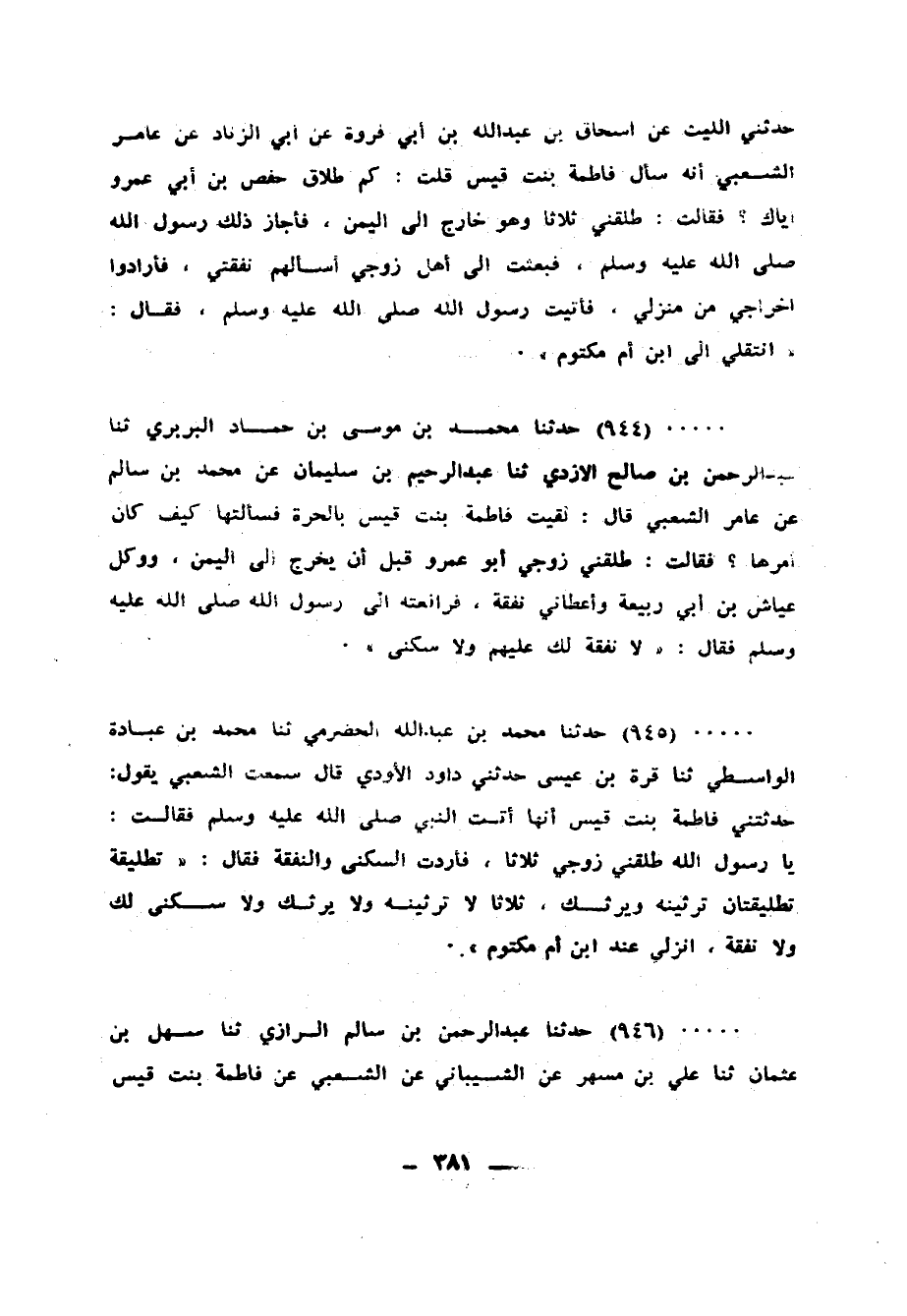 944 - حَدَّثَنَا مُحَمَّدُ بْنُ مُوسَى بْنِ حَمَّادٍ الْبَرْبَرِيُّ، ثنا عَبْدُ الرَّحْمَنِ بْنُ صَالِحٍ الْأَزْدِيُّ، ثنا عَبْدُ الرَّحِيمِ بْنُ سُلَيْمَانَ، عَنْ مُحَمَّدِ بْنِ سَالِمٍ، عَنْ عَامِرٍ الشَّعْبِيِّ، قَالَ: لَقِيتُ فَاطِمَةَ بِنْتَ قَيْسٍ بِالْحَرَّةِ فَسَأَلْتُهَا كَيْفَ كَانَ أَمْرُهَا؟ فَقَالَتْ: طَلَّقَنِي زَوْجِي أَبُو عَمْرٍو قَبْلَ أَنْ يَخْرُجَ إِلَى الْيَمَنِ، وَوَكَّلَ عَيَّاشَ بْنَ أَبِي رَبِيعَةَ، وَأَعْطَانِي نَفَقَةً، فَرَافَعْتُهُ إِلَى رَسُولِ اللهِ صَلَّى اللهُ عَلَيْهِ وَسَلَّمَ فَقَالَ: «§لَا نَفَقَةَ لَكِ عَلَيْهِمْ وَلَا سُكْنَى»