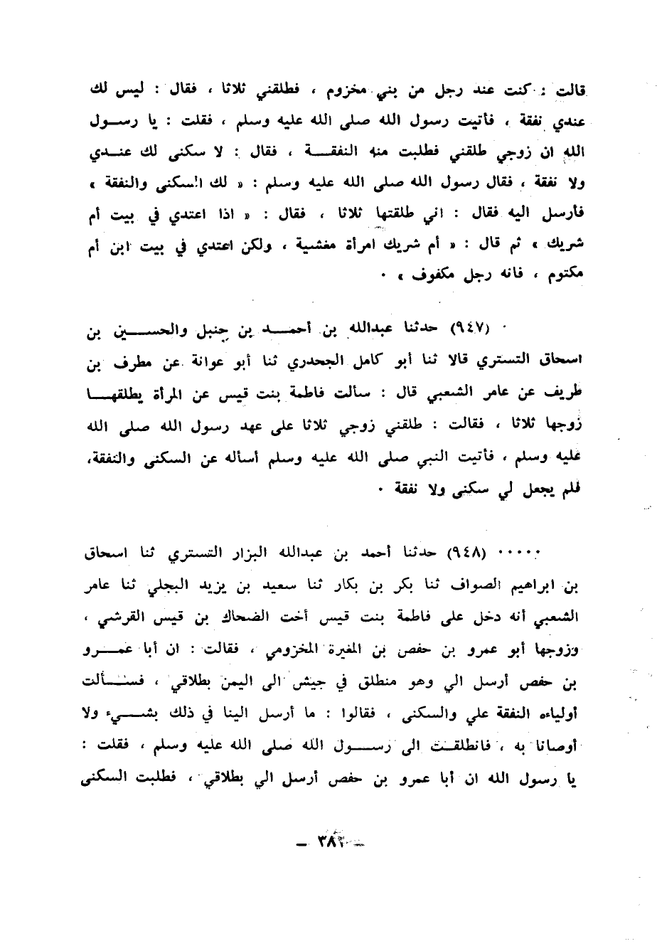 947 - حَدَّثَنَا عَبْدُ اللهِ بْنُ أَحْمَدَ بْنِ حَنْبَلٍ، وَالْحُسَيْنُ بْنُ إِسْحَاقَ التُّسْتَرِيُّ، قَالَا: ثنا أَبُو كَامِلٍ الْجَحْدَرِيُّ، ثنا أَبُو عَوَانَةَ، عَنْ مُطَرِّفِ بْنِ طَرِيفٍ، عَنْ عَامِرٍ الشَّعْبِيِّ، قَالَ: سَأَلْتُ فَاطِمَةَ بِنْتَ قَيْسٍ عَنِ الْمَرْأَةِ يُطَلِّقُهَا زَوْجُهَا ثَلَاثًا، فَقَالَتْ: «طَلَّقَنِي زَوْجِي ثَلَاثًا عَلَى عَهْدِ رَسُولِ اللهِ صَلَّى اللهُ عَلَيْهِ وَسَلَّمَ فَأَتَيْتُ النَّبِيَّ صَلَّى اللهُ عَلَيْهِ وَسَلَّمَ أَسْأَلُهُ عَنِ السُّكْنَى، وَالنَّفَقَةِ، §فَلَمْ يَجْعَلْ لِي سُكْنَى، وَلَا نَفَقَةَ»