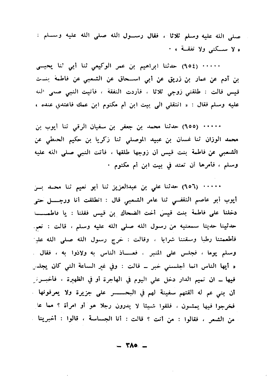 955 - حَدَّثَنَا مُحَمَّدُ بْنُ جَعْفَرَ بْنِ سُفْيَانَ الرَّقِّيُّ، ثنا أَيُّوبُ بْنُ مُحَمَّدٍ الْوَزَّانُ، ثنا غَسَّانُ بْنُ عُبَيْدٍ الْمَوْصِلِيُّ، ثنا زَكَرِيَّا بْنُ حَكِيمٍ الْحَبَطِيُّ، عَنِ الشَّعْبِيِّ، عَنْ فَاطِمَةَ بِنْتِ قَيْسٍ، «أَنَّ زَوْجَهَا طَلَّقَهَا، فَأَتَتِ النَّبِيَّ صَلَّى اللهُ عَلَيْهِ وَسَلَّمَ §فَأَمَرَهَا أَنْ تَعْتَدَّ فِي بَيْتِ ابْنِ أُمِّ مَكْتُومٍ»