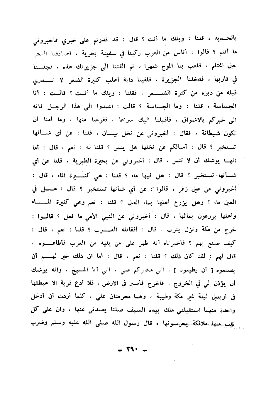 فَأَقْبَلْنَا إِلَيْكَ سِرَاعًا فَفَزِعْنَا مِنْهَا ، وَمَا أَمِنَّا أَنْ تَكُونَ شَيْطَانَةً ، فَقَالَ : أَخْبِرُونِي عَنْ نَخْلِ بَيْسَانَ ؟ قُلْنَا : عَنْ أَيِّ شَأْنِهَا تَسْتَخْبِرُ ؟ قَالَ : أَسْأَلُكُمْ عَنْ نَخْلِهَا ، هَلْ يُثْمِرُ ؟ قُلْنَا لَهُ : نَعَمْ ، قَالَ : أَمَا أَنَّهَا يُوشِكُ أَنْ لاَ تُثْمِرَ ، قَالَ : أَخْبِرُونِي عَنْ بُحَيْرَةِ الطَّبَرِيَّةِ ؟ قُلْنَا : عَنْ أَيِّ شَأْنِهَا تَسْتَخْبِرُ ؟ قَالَ : هَلْ فِيهَا مَاءٌ ؟ قُلْنَا : هِيَ كَثِيرَةُ الْمَاءِ ، قَالَ : أَخْبِرُونِي عَنْ عَيْنِ زُغَرٍ ، قَالُوا : عَنْ أَيِّ شَأْنِهَا تَسْتَخْبِرُ ؟ قَالَ : هَلْ فِي الْعَيْنِ مَاءٌ ، وَهَلْ يَزْرَعُ أَهْلُهَا بِمَاءِ الْعَيْنِ ؟ قُلْنَا : نَعَمْ وَهِيَ كَثِيرَةُ الْمَاءِ ، وَأَهْلُهَا يَزْرَعُونَ بِمَائِهَا ، قَالَ : أَخْبِرُونِي عَنِ النَّبِيِّ الأُمِّيِّ مَا فَعَلَ ؟ قَالُوا : خَرَجَ مِنْ مَكَّةَ ، وَنَزَلَ يَثْرِبَ ، قَالَ : أَفَقَاتَلَهُ الْعَرَبُ ؟ قُلْنَا : نَعَمْ ، قَالَ : كَيْفَ صَنَعَ بِهِمْ ؟ فَأَخْبَرْنَاهُ أَنَّهُ ظَهْرَ عَلَى مَنْ يَلِيهِ مِنَ الْعَرَبِ ، فَأَطَاعُوهُ قَالَ لَهُمْ : لَقَدْ كَانَ ذَلِكَ ؟ قُلْنَا : نَعَمْ ، قَالَ : أَمَا أَنَّ ذَلِكَ خَيْرٌ لَهُمْ أَنْ يَصْنَعُوهُ أَنْ يُطِيعُوهُ ، إِنِّي مُخْبِرُكُمْ عَنِّي ، إِنِّي أَنَا الْمَسِيحُ ، وَأَنَّهُ يُوشِكُ أَنْ يُؤْذَنَ لِي فِي الْخُرُوجِ ، فَأَخْرُجُ فَأَسِيرُ فِي الأَرْضِ ، فَلاَ أَدَعُ قَرْيَةً إِلاَّ هَبَطْتُهَا فِي أَرْبَعِينَ لَيْلَةً ، غَيْرَ مَكَّةَ ، وَطَيْبَةَ ، وَهُمَا مُحَرَّمَتَانِ عَلِيَّ ، كُلَّمَا أَرَدْتُ أَنْ أَدْخُلَ وَاحِدَةً مِنْهُمَا اسْتَقْبَلَنِي مَلَكٌ بِيَدِهِ السَّيْفُ صَلْتًا يَصُدُّنِي عَنْهَا ، وَإِنَّ عَلَى كُلِّ نَقْبٍ مِنْهَا مَلاَئِكَةً يَحْرُسُونَهَا ، قَالَ رَسُولُ اللهِ صَلَّى اللَّهُ عَلَيْهِ وَسَلَّمَ وَضَرَبَ بِمِخْصَرَتِهِ الْمِنْبَرَ : هَذِهِ طَيْبَةُ ، هَذِهِ طَيْبَةُ ، هَذِهِ طَيْبَةُ - يَعْنِي الْمَدِينَةَ - أَلاَ هَلْ كُنْتُ حَدَّثْتُكُمْ ذَلِكَ ؟ فَقَالَ النَّاسُ : نَعَمْ ، قَالَ : فَإِنَّمَا أَعْجَبَنِي حَدِيثُ تَمِيمٍ الدَّارِيُّ لأَنَّهُ وَافَقَ الَّذِي كُنْتُ أُحَدِّثُكُمْ عَنْهُ ، وَعَنِ الْمَدِينَةِ ، وَمَكَّةَ ، أَلاَ أَنَّهُ فِي بَحْرِ الشَّامِ ، أَوْ بَحْرِ الْيَمَنِ ، لاَ بَلْ مِنْ قِبَلِ الْمَشْرِقِ ، مَا هُوَ مِنْ قِبَلِ الْمَشْرِقِ مَا هُوَ مِنْ قِبَلِ الْمَشْرِقِ مَا هُوَ مِنْ قِبَلِ الْمَشْرِقِ ، وأَوْمَا بِيَدِهِ إِلَى الْمَشْرِقِ ، قَالَتْ : حَفِظْتُ هَذَا مِنْ رَسُولِ اللهِ صَلَّى اللَّهُ عَلَيْهِ وَسَلَّمَ.