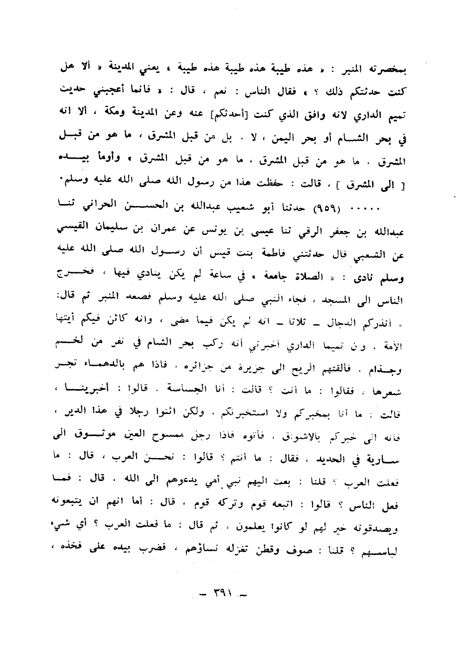 959 - حَدَّثَنَا أَبُو شُعَيْبٍ عَبْدُ اللهِ بْنُ الْحَسَنِ الْحَرَّانِيُّ، ثنا عَبْدُ اللهِ بْنُ جَعْفَرٍ الرَّقِّيُّ، ثنا عِيسَى بْنُ يُونُسَ، عَنْ عِمْرَانَ بْنِ سُلَيْمَانَ الْقَيْسِيِّ، عَنِ الشَّعْبِيِّ، قَالَ: حَدَّثَتْنِي فَاطِمَةُ بِنْتُ قَيْسٍ، أَنَّ رَسُولَ اللهِ صَلَّى اللهُ عَلَيْهِ وَسَلَّمَ نَادَى: «الصَّلَاةَ جَامِعَةً» فِي سَاعَةٍ لَمْ يَكُنْ يُنَادِي فِيهَا، فَخَرَجَ النَّاسُ إِلَى الْمَسْجِدِ فَجَاءَ النَّبِيُّ صَلَّى اللهُ عَلَيْهِ وَسَلَّمَ فَصَعِدَ الْمِنْبَرَ، ثُمَّ قَالَ: " أُنْذِرُكُمُ الدَّجَّالَ - ثَلَاثًا - إِنَّهُ لَمْ يَكُنْ فِيمَا مَضَى، وَإِنَّهُ كَائِنٌ فِيكُمْ أَيَّتُهَا الْأُمَّةُ، §وَإِنَّ تَمِيمًا الدَّارِيَّ أَخْبَرَنِي أَنَّهُ رَكِبَ بَحْرَ الشَّامِ فِي نَفَرٍ مِنْ لَخْمٍ، وَجُذَامٍ فَأَلْقَتْهُمُ الرِّيحَ إِلَى جَزِيرَةٍ مِنْ جَزَائِرِهِ، فَإِذَا هُمْ بِالدَّهْمَاءِ تَجُرُّ شَعْرَهَا، فَقَالُوا: مَا أَنْتِ؟ قَالَتْ: أَنَا الْجَسَّاسَةُ، قَالُوا: أَخْبِرِينَا قَالَتْ: مَا أَنَا بِمُخْبِرِكُمْ وَلَا اسْتَخْبَرْتُكُمْ، وَلَكِنِ ائْتُوا رَجُلًا فِي هَذَا الدَّيْرِ فَإِنَّهُ إِلَى خَبَرِكُمْ بِالْأَشْوَاقِ، فَأَتَوْهُ فَإِذَا رَجُلٌ مَمْسُوحُ الْعَيْنِ مَوْثُوقٌ إِلَى سَارِيَةٍ فِي الْحَدِيدِ، فَقَالَ: مَا أَنْتُمْ؟ قَالُوا: نَحْنُ الْعَرَبُ، قَالَ: مَا فَعَلَتِ الْعَرَبُ؟ قُلْنَا: بُعِثَ إِلَيْهِمْ نَبِيٌّ أُمِّيٌّ يَدْعُوهُمْ إِلَى اللهِ، قَالَ: فَمَا فَعَلَ النَّاسُ؟ قَالُوا: اتَّبَعَهُ قَوْمٌ وَتَرَكَهُ قَوْمٌ، قَالَ: أَمَا إِنَّهُمْ إِنْ يَتَّبِعُونَهُ وَيُصَدِّقُونَهُ خَيْرٌ لَهُمْ لَوْ كَانُوا يَعْلَمُونَ ثُمَّ قَالَ: مَا فَعَلَتِ الْعَرَبُ؟ أَيُّ شَيْءٍ لِباسُهُمْ؟ قُلْنَا: صُوفٌ وَقُطْنٌ تَغْزِلُهُ نِسَاؤُهُمْ، فَضَرَبَ بِيَدِهِ عَلَى فَخِذِهِ، ثُمَّ قَالَ: هَيْهَاتَ، ثُمَّ قَالَ: مَا فَعَلَتْ نَخْلُ بَيْسَانَ؟ قُلْنَا: قَوِيَ، ونَجِدُها فِي كُلِّ عَامٍ فَضَرَبَ بِيَدِهِ عَلَى فَخِذِهِ، ثُمَّ قَالَ: هَيْهَاتَ، ثُمَّ قَالَ: مَا فَعَلَتْ عَيْنُ زُغَرٍ؟ قُلْنَا: كَثِيرٌ مَاؤُهَا يَتَدَفَّقُ يَرْوِي مَنْ أَتَاهَا، فَضَرَبَ بِيَدِهِ عَلَى فَخِذِهِ، ثُمَّ قَالَ: هَيْهَاتَ، ثُمَّ قَالَ: لَوْ قَدْ أَطْلَقَنِي اللهُ مِنْ وَثَاقِي لَمْ يَبْقَ مَنْهَلٌ إِلَّا دَخَلْتُهُ إِلَّا مَكَّةَ وَطَيْبَةَ، فَإِنَّهُ لَيْسَ لِي دُخُولُهُما "، قَالَ رَسُولُ اللهِ صَلَّى اللهُ عَلَيْهِ وَسَلَّمَ: «تِلْكَ مَكَّةُ، وَهَذِهِ طَيْبَةُ حَرَّمَهَا اللهُ كَمَا حَرَّمَ إِبْرَاهِيمُ مَكَّةَ، أَمَا أَنَّهُ لَيْسَ نَقْبٌ، وَلَا سِكَّةٌ إِلَّا وَعَلَيْهَا مَلَكٌ شَاهِرٌ للسَّيْفِ يَمْنَعُهَا مِنَ الدَّجَّالِ إِلَى يَوْمِ الْقِيَامَةِ»