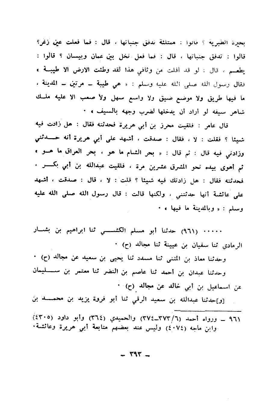961 - حَدَّثَنَا أَبُو مُسْلِمٍ الْكَشِّيُّ، ثنا إِبْرَاهِيمُ بْنُ بَشَّارٍ الرَّمَادِيُّ، ثنا سُفْيَانُ بْنُ عُيَيْنَةَ، ثنا مُجَالِدٌ، ح وَحَدَّثَنَا مُعَاذُ بْنُ الْمُثَنَّى، ثنا مُسَدَّدٌ، ثنا يَحْيَى بْنُ سَعِيدٍ، عَنْ مُجَالِدٍ، ح وَحَدَّثَنَا عَبْدَانُ بْنُ أَحْمَدَ، ثنا عَاصِمُ بْنُ النَّضْرِ، ثنا مُعْتَمِرُ بْنُ سُلَيْمَانَ، عَنْ إِسْمَاعِيلَ بْنِ أَبِي خَالِدٍ، عَنْ مُجَالِدٍ، ح وَحَدَّثَنَا عَبْدُ اللهِ بْنُ سَعِيدٍ الرَّقِّيُّ، ثنا أَبُو فَرْوَةَ يَزِيدُ بْنُ مُحَمَّدِ بْنِ -[394]- سِنَانٍ الرَّهَاوِيُّ، حَدَّثَنِي أَبِي، عَنْ أَبِيهِ، حَدَّثَنِي زَيْدُ بْنُ أَبِي أُنَيْسَةَ، عَنْ مُجَالِدِ بْنِ سَعِيدٍ، حَدَّثَنِي عَامِرٌ الشَّعْبِيُّ، حَدَّثَتْنِي فَاطِمَةُ بِنْتُ قَيْسٍ، قَالَتْ: خَرَجَ رَسُولُ اللهِ صَلَّى اللهُ عَلَيْهِ وَسَلَّمَ يَوْمًا مِنَ الْأَيَّامِ، فَصَلَّى صَلَاةَ الْهَاجِرَةِ، ثُمَّ قَعَدَ فَفَزِعَ النَّاسُ فَقَالَ: " يَا أَيُّهَا النَّاسُ، إِنِّي لَمْ أَقُمْ مَقَامِي هَذَا للفَزَعِ، وَلَكِنَّ §تَمِيمًا الدَّارِيَّ أَتَانِي فَأَخْبَرَنِي خَبَرًا مَنَعَ مِنِّي الْقَيْلُولَةَ مَعَ الْفَرَحِ، وَقُرَّةِ الْعَيْنِ، فَأَحْبَبْتُ أَنْ أُبَشِّرَكُمْ بِفَرَحِ نَبِيِّكُمْ، أَخْبَرَنِي أَنَّ رَهْطًا مِنْ بَنِي عَمِّهِ رَكِبُوا الْبَحْرَ، فَأَصَابَهُمْ عَاصِفٌ فَأَلْجَأَتْهُمْ إِلَى جَزِيرَةٍ، فَقَعَدُوا فِي قَرَبِ سَفِينَةٍ حَتَّى خَرَجُوا إِلَى الْجَزِيرَةِ، فَإِذَا هُمْ بِشَيْءٍ أَهْلَبَ كَثِيرِ الشَّعْرِ، لَا يَدْرُونَ رَجُلٌ هُوَ أَوِ امْرَأَةٌ، فَسَلَّمُوا عَلَيْهِ فَرَدَّ عَلَيْهِمْ، قَالُوا: أَلَا تُخْبِرُنَا؟ قَالَ: مَا أَنَا بِمُخْبِرِكُمْ، وَلَا مُسْتَخْبِرِكُمْ، وَلَكِنَّ هَذَا الدَّيْرَ قَدْ رَأَيْتُمُوهُ، فَفِيهِ مَنْ هُوَ إِلَى خَبَرِكُمْ بِالْأَشْوَاقِ، أَنْ يُخْبِرَكُمْ وَأَنْ يَسْتَخْبِرَكُمْ، قُلْنَا: فَمَا أَنْتَ؟ قَالَتْ: أَنَا الْجَسَّاسَةُ، فَانْطَلَقُوا حَتَّى أَتَوُا الدَّيْرَ فَإِذَا هُمْ بِرَجُلٍ مُوثَقٍ فِي الْحَدِيدِ، شَدِيدِ الْوَثَاقِ مُظْهِرِ الْحُزْنِ، كَثِيرِ التَّشَكِّي، فَسَلَّمُوا عَلَيْهِ فَرَدَّ عَلَيْهِمْ، وَقَالَ: مَنْ أَنْتُمْ؟ قُلْنَا: مِنَ الْعَرَبِ، قَالَ: مَا فَعَلَتِ الْعَرَبُ، أَخْرَجَ نَبِيُّهُمْ بَعْدُ؟ قَالُوا: نَعَمْ، قَالَ: فَمَا فَعَلُوا؟ قُلْنَا: خَيْرًا، آمَنُوا بِهِ وَاتَّبَعُوهُ وَصَدَّقُوهُ، قَالَ: ذَاكَ خَيْرٌ لَهُمْ، قَالُوا: وَكَانَ لَهُ أَعْدَاءٌ فَأَظْهَرَهُ اللهُ عَلَيْهِمْ، قَالَ: فَالْعَرَبُ إِلَهُهُمْ وَاحِدٌ، وَكَلِمَتُهُمْ وَاحِدَةٌ، وَدِينُهُمْ وَاحِدٌ؟ قَالُوا: نَعَمْ، قَالَ: فَمَا فَعَلَتْ عَيْنُ زُغَرٍ؟ قَالُوا: هِيَ طَافِحَةٌ يَشْرَبُ أَهْلُهَا سَقْيَهُمْ، وَيَسْقُونَ مِنْهَا زَرْعَهُمْ، قَالَ: فَمَا فَعَلَ نَخْلٌ بَيْنَ عُمَانَ، وَبَيْسَانَ؟ قَالُوا: يُطْعِمُ جَنَاهُ كُلَّ عَامٍ، قَالَ: فَمَا فَعَلَتْ بُحَيْرَةُ الطَّبَرِيَّةِ؟ قَالُوا: هِيَ مَلْأَى، قَالَ: فَزَفَرَ، ثُمَّ زَفَرَ، ثُمَّ حَلَفَ، لَوْ قَدْ خَرَجْتُ مِنْ مَكَانِي هَذَا مَا تَرَكْتُ أَرْضًا مِنْ أَرْضِ اللهِ إِلَّا وَطَأْتُها غَيْرَ طَيْبَةَ، لَيْسَ لِي عَلَيْهَا سُلْطَانٌ "، فَقَالَ رَسُولُ اللهِ صَلَّى اللهُ عَلَيْهِ وَسَلَّمَ: «إِنَّ هَذَا مِمَّا أَفَرَحَنِي - قَالَهَا ثَلَاثًا - إِنَّ طَيْبَةَ هِيَ الْمَدِينَةُ، ثُمَّ إِنَّ اللهَ حَرَّمَ حَرَمَيَّ عَلَى الدَّجَّالِ» ثُمَّ حَلَفَ رَسُولُ اللهِ صَلَّى اللهُ عَلَيْهِ وَسَلَّمَ: «وَاللهِ الَّذِي لَا إِلَهَ إِلَّا هُوَ مَا لَهَا طَرِيقٌ ضَيِّقٌ، وَلَا وَاسِعٌ سَهْلٌ، وَلَا جَبَلٌ إِلَّا عَلَيْهِ مَلَكٌ شَاهِرٌ بِالسَّيْفِ إِلَى يَوْمِ الْقِيَامَةِ، مَا ي