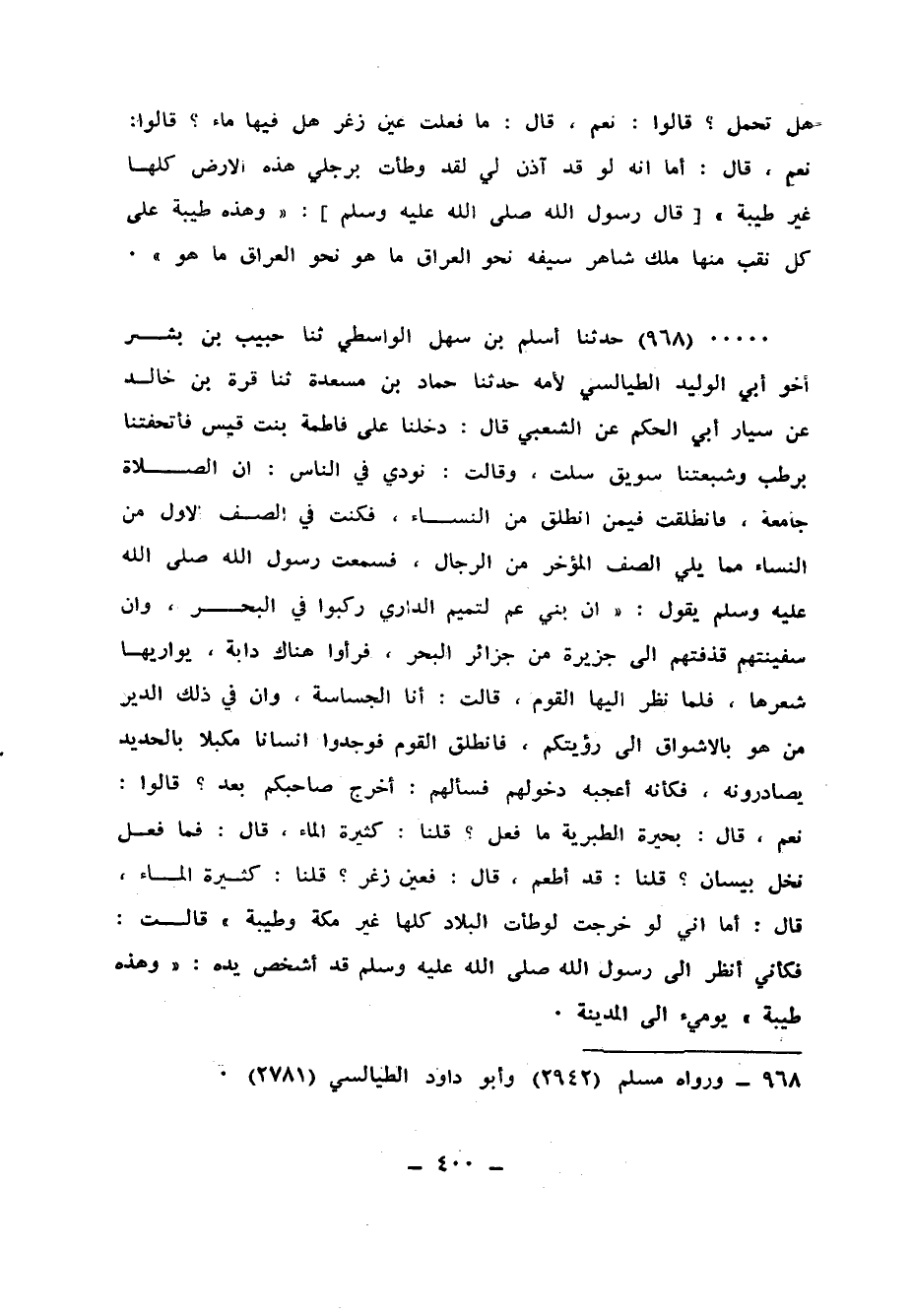 968 - حَدَّثَنَا أَسْلَمُ بْنُ سَهْلٍ الْوَاسِطِيُّ، ثنا حَبِيبُ بْنُ بِشْرٍ، أَخُو أَبِي الْوَلِيدِ الطَّيَالِسِيِّ لِأُمِّهِ، حَدَّثَنَا حَمَّادُ بْنُ مَسْعَدَةَ، ثنا قُرَّةُ بْنُ خَالِدٍ، عَنْ سَيَّارٍ أَبِي الْحَكَمِ، عَنِ الشَّعْبِيِّ، قَالَ: دَخَلْنَا عَلَى فَاطِمَةَ بِنْتِ قَيْسٍ فَأَتْحَفَتْنَا بِرُطَبٍ، وَشَبَّعَتْنا سَوِيقَ سَلْتٍ وَقَالَتْ: نُودِيَ فِي النَّاسِ: أَنَّ الصَّلَاةَ جَامِعَةٌ، فَانْطَلَقْتُ فِيمَنِ انْطَلَقَ مِنَ النِّسَاءِ، فَكُنْتُ فِي الصَّفِّ الْأَوَّلِ مِنَ النِّسَاءِ، مِمَّا يَلِي الصَّفَّ الْمُؤَخَّرِ مِنَ الرِّجَالِ، فَسَمِعْتُ رَسُولَ اللهِ صَلَّى اللهُ عَلَيْهِ وَسَلَّمَ يَقُولُ: " إِنَّ §بَنِي عَمٍّ لِتَمِيمٍ الدَّارِيِّ رَكِبُوا فِي الْبَحْرِ، وَإِنَّ سَفِينَتَهُمْ قَذَفَتْهُمْ إِلَى جَزِيرَةٍ مِنْ جَزَائِرِ الْبَحْرِ فَرَأَوْا هُنَاكَ دَابَّةً يُوَارِيهَا شَعْرُهَا، فَلَمَّا نَظَرَ إِلَيْهَا الْقَوْمُ، قَالَتْ: أَنَا الْجَسَّاسَةُ، وَإِنَّ فِي ذَلِكَ الدَّيْرِ مَنْ هُوَ بِالْأَشْوَاقِ إِلَى رُؤْيَتِكُمْ فَانْطَلَقَ الْقَوْمُ فَوَجَدُوا إِنْسَانًا مُكَبَّلًا بِالْحَدِيدِ يُصادِرُونَهُ، فَكَأَنَّهُ أَعْجَبَهُ دُخُولُهُمْ فَسَأَلَهُمْ أَخْرَجَ صَاحِبُكُمْ بَعْدُ؟ قَالُوا: نَعَمْ، قَالَ: بُحَيْرَةُ الطَّبَرِيَّةِ مَا فَعَلَ؟ قُلْنَا: كَثِيرَةُ الْمَاءِ، قَالَ: فَمَا فَعَلَ نَخْلُ بَيْسَانَ؟ قُلْنَا: قَدْ أَطْعَمَ، قَالَ: فَعَيْنُ زُغَرٍ؟ قُلْنَا: كَثِيرَةُ الْمَاءِ، قَالَ: أَمَا أَنِّي لَوْ خَرَجْتُ لَوَطَأْتُ الْبِلَادَ كُلَّهَا غَيْرَ مَكَّةَ، وَطَيْبَةَ "، قَالَتْ: فَكَأَنِّي أَنْظُرُ إِلَى رَسُولِ اللهِ صَلَّى اللهُ عَلَيْهِ وَسَلَّمَ قَدْ أَشْخَصَ يَدَهُ: «هَذِهِ طَيْبَةُ يُومِئُ إِلَى الْمَدِينَةِ»