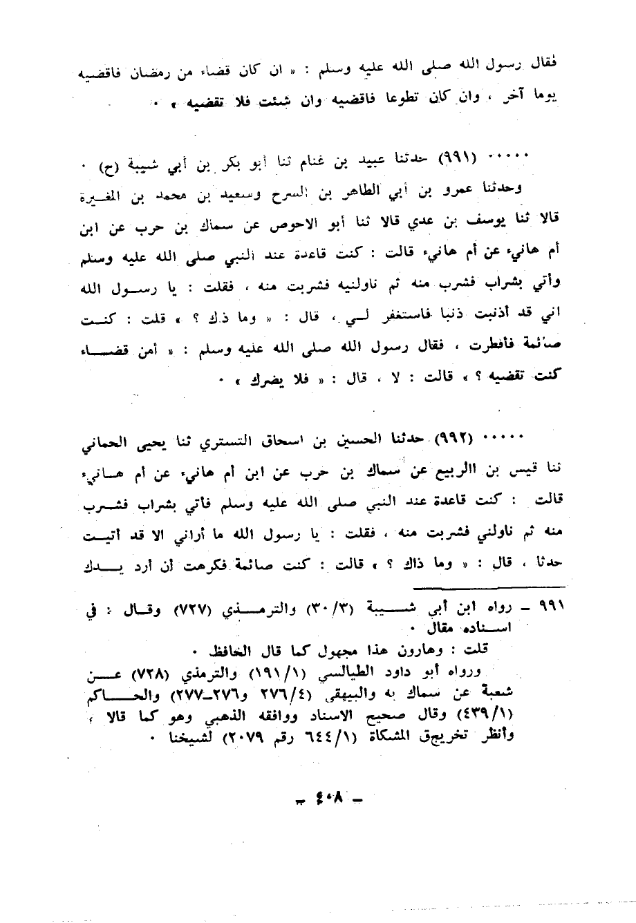 991 - حَدَّثَنَا عُبَيْدُ بْنُ غَنَّامٍ، ثنا أَبُو بَكْرِ بْنُ أَبِي شَيْبَةَ، ح وَحَدَّثَنَا عَمْرُو بْنُ أَبِي الطَّاهِرِ بْنِ السَّرْحِ، وَسَعِيدُ بْنُ مُحَمَّدِ بْنِ الْمُغِيرَةِ، قَالَا: ثنا يُوسُفُ بْنُ عَدِيٍّ، قَالَا: ثنا أَبُو الْأَحْوَصِ، عَنْ سِمَاكِ بْنِ حَرْبٍ، عَنِ ابْنِ أُمِّ هَانِئٍ، عَنْ أُمِّ هَانِئٍ، قَالَتْ: كُنْتُ قَاعِدَةً عِنْدَ النَّبِيِّ صَلَّى اللهُ عَلَيْهِ وَسَلَّمَ وَأُتِيَ بِشَرَابٍ فَشَرِبَ مِنْهُ، ثُمَّ نَاوَلَنِيهِ فَشَرِبْتُ مِنْهُ، فَقُلْتُ: يَا رَسُولَ اللهِ إِنِّي قَدْ أَذْنَبْتُ ذَنْبًا فَاسْتَغْفِرْ لِي، قَالَ: «وَمَا ذَاكَ؟» قُلْتُ: كُنْتُ صَائِمَةً فَأَفْطَرْتُ، فَقَالَ رَسُولُ اللهِ صَلَّى اللهُ عَلَيْهِ وَسَلَّمَ: «§أَمِنْ قَضَاءٍ كُنْتِ تَقْضِيهِ؟» قَالَتْ: لَا، قَالَ: «فَلَا يَضُرُّكِ»